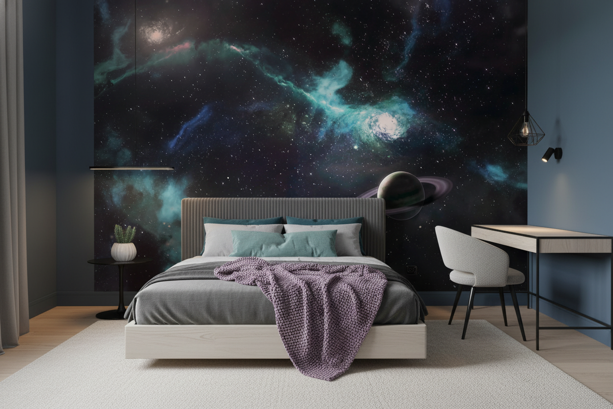 Plongez dans l’immensité cosmique avec ce papier peint sur mesure. Admirez nébuleuses turquoise, planète aux anneaux et galaxies. Créez une atmosphère unique d’évasion et de rêve. Votre mur devient une fenêtre ouverte sur l’univers infini.
