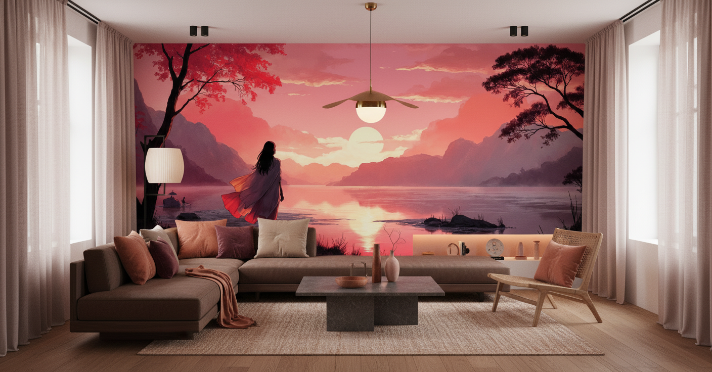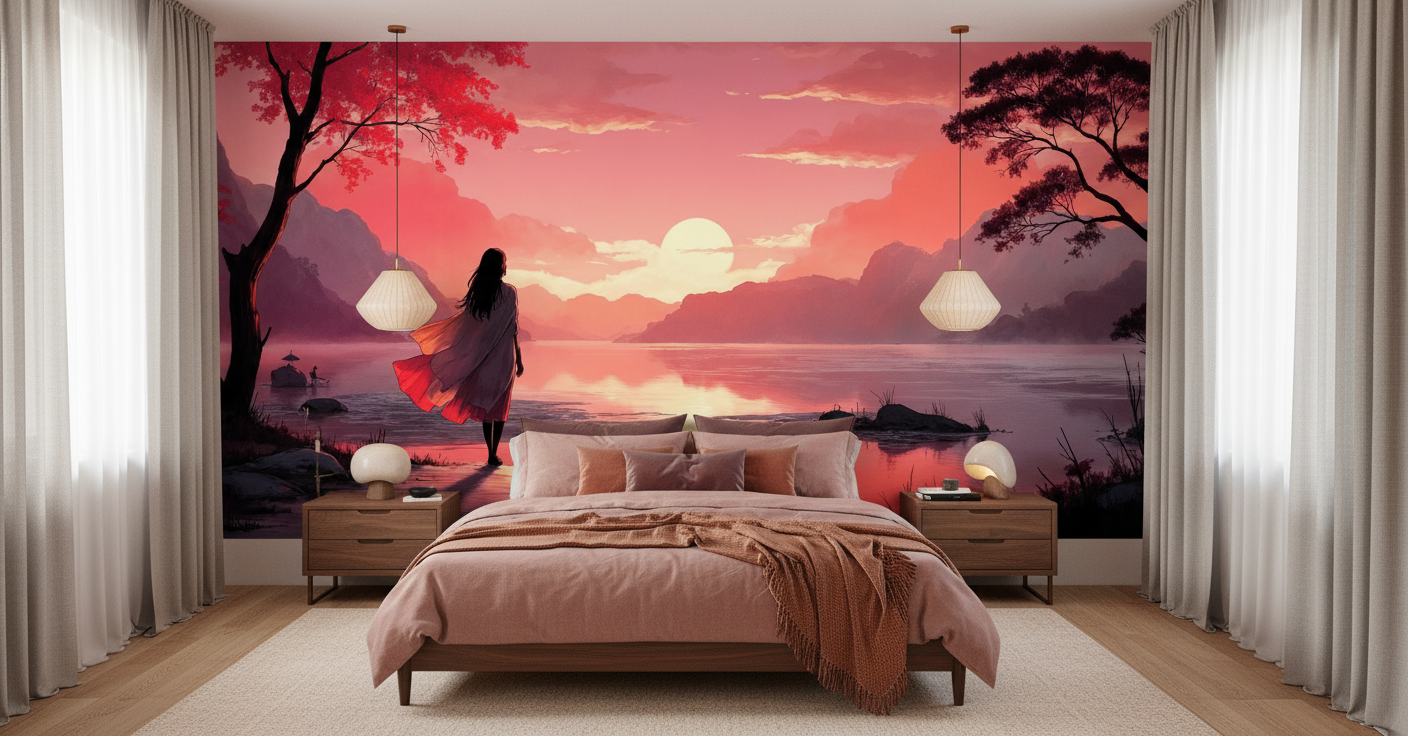 La richesse de ce papier peint coucher de soleil réside dans sa palette exceptionnelle de tons chauds et romantiques. Les rouges profonds du kimono et des feuillages s’harmonisent parfaitement avec les roses poudrés et les violets nuancés du ciel crépusculaire. Cette symphonie chromatique transforme instantanément l’atmosphère d’une pièce, y insufflant une douceur contemplative et une sérénité orientale.