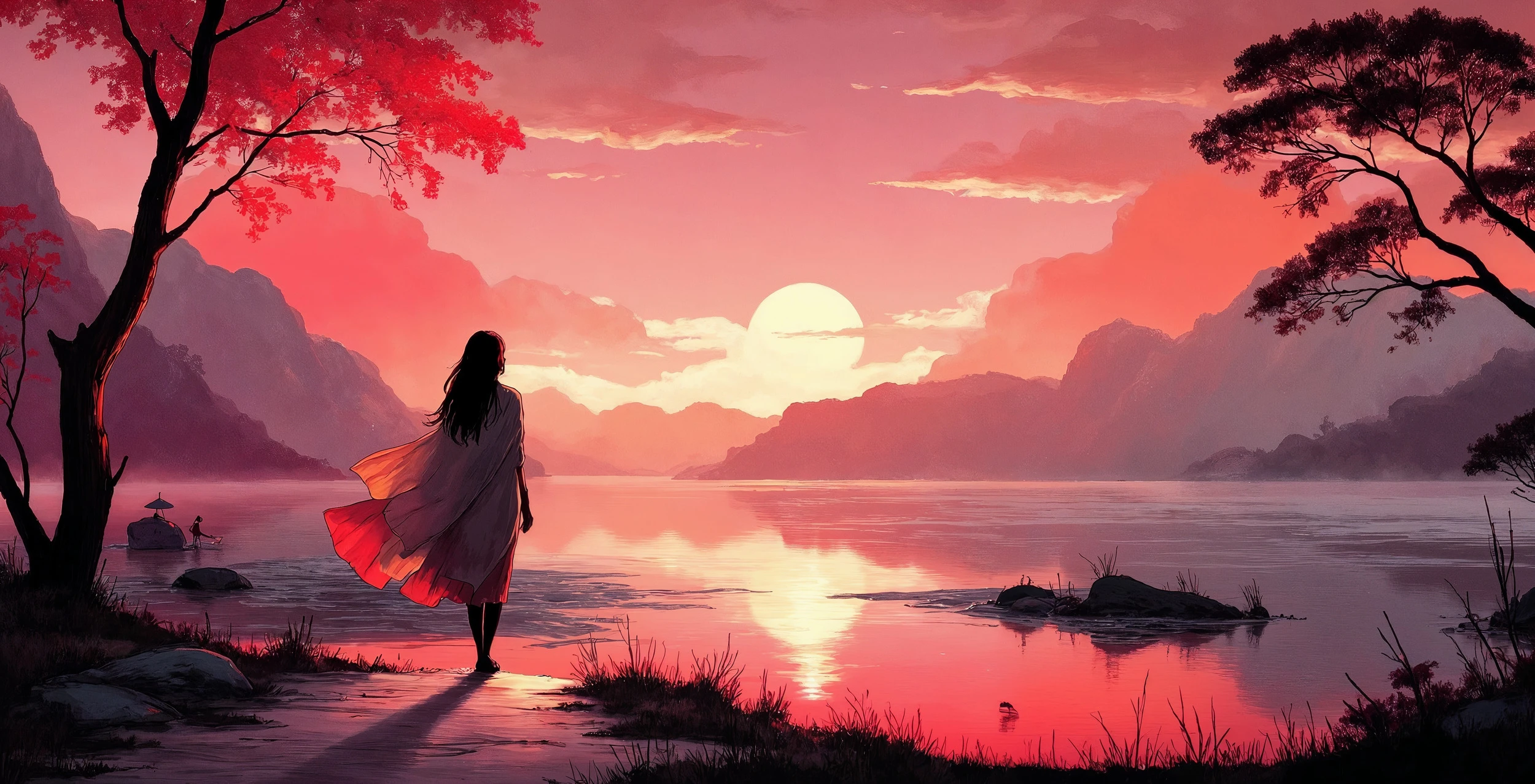 Ce papier peint paysage romantique dévoile une scène d’une poésie infinie : une silhouette féminine aux longs cheveux flottants se dresse face à un lac miroir, drapée dans un kimono rouge écarlate qui danse avec la brise du soir. Le style graphique, inspiré de l’art asiatique contemporain, mêle avec subtilité les codes de l’illustration digitale et de la peinture traditionnelle.