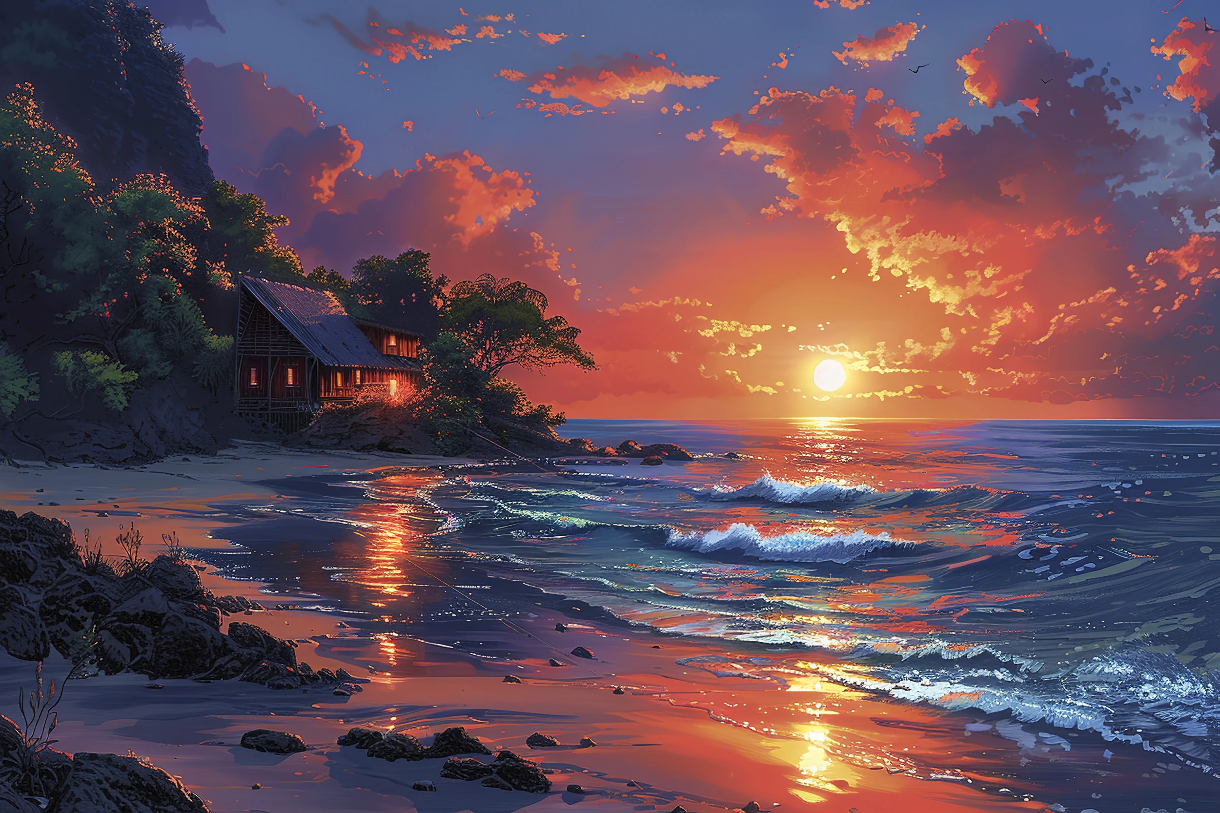 Ce papier peint paysage maritime révèle une composition d’une beauté saisissante, où une **cabane traditionnelle** aux fenêtres illuminées se niche délicatement entre une **végétation luxuriante** et une **plage dorée**. Le style artistique, empreint de réalisme pictural, évoque les plus belles toiles impressionnistes avec sa technique raffinée mêlant **peinture numérique** et sensibilité aquarellée. Les **tons chauds** dominent harmonieusement la palette : des **oranges flamboyants** et **roses poudrés** du ciel couchant aux **bleus profonds** de l’océan, en passant par les **verts émeraude** de la forêt tropicale qui encadre cette scène idyllique.