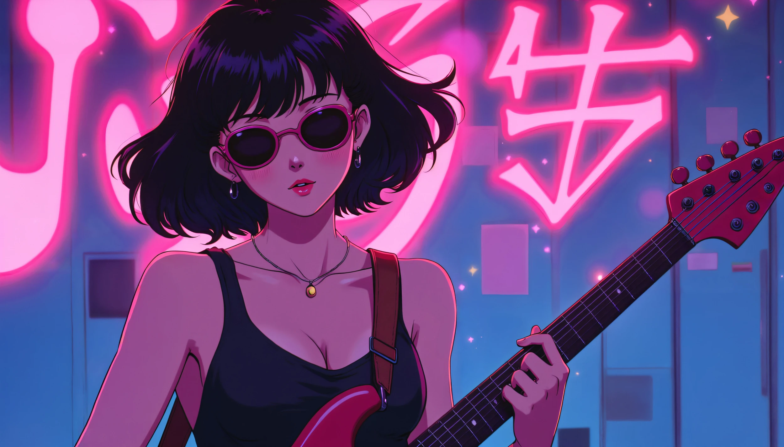 Ce papier peint anime d’exception met en scène une mystérieuse musicienne aux allures de manga, baignée dans une atmosphère néon rose et violet saisissante. Ses cheveux noirs ondulent avec grâce tandis qu’elle tient sa guitare électrique rouge, créant une symphonie visuelle entre musique et technologie. Ses lunettes de soleil rondes et vintage ajoutent une touche rétro-futuriste parfaitement maîtrisée. L’arrière-plan révèle des caractères japonais lumineux qui semblent flotter dans un décor urbain nocturne, où se mêlent architecture contemporaine et signalétique nippone authentique.