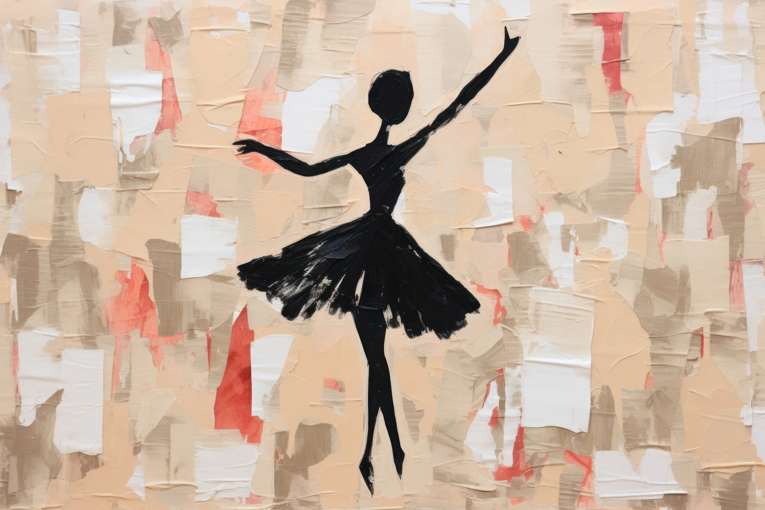 Ce papier peint artistique révèle une composition d’une beauté époustouflante : au centre, une ballerine en silhouette noire déploie ses bras dans un mouvement d’une fluidité parfaite, sa robe de tutu virevoltant dans une danse éternelle. L’arrière-plan se compose d’un patchwork délicat de formes géométriques aux tons poudrés – beiges nacrés, roses corail tendres et blancs immaculés – créant un effet de collage artistique d’une modernité saisissante. Cette technique graphique évoque l’art du mixed-media et de la peinture contemporaine, où chaque fragment de couleur semble avoir été délicatement appliqué à la main.