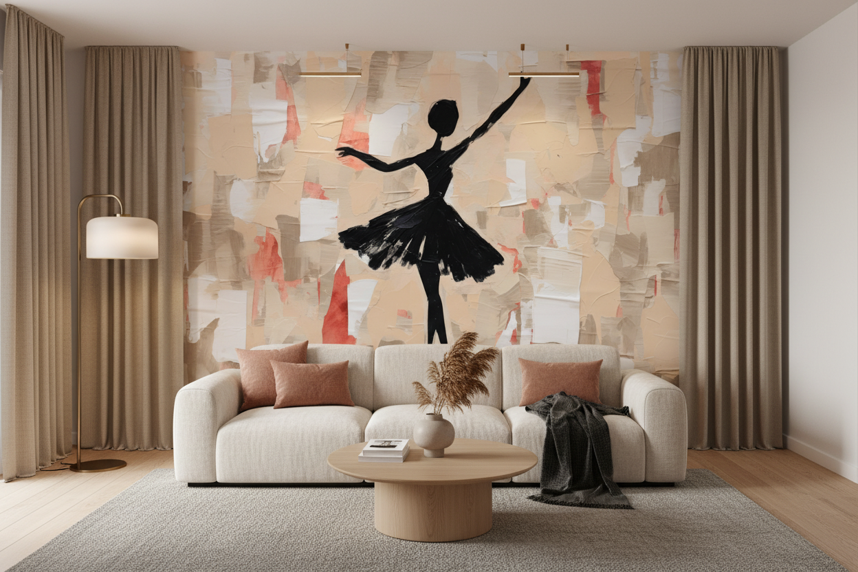 Pour sublimer cette décoration murale artistique, intégrez des éléments décoratifs qui prolongent l’univers de la danse : miroirs aux formes organiques, luminaires aux lignes courbes, coussins en soie rose ou plaids en mohair beige. Les matières naturelles comme le bois clair, le rotin et le marbre rose créeront un dialogue harmonieux avec les tonalités du papier peint.