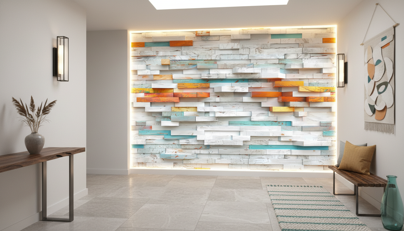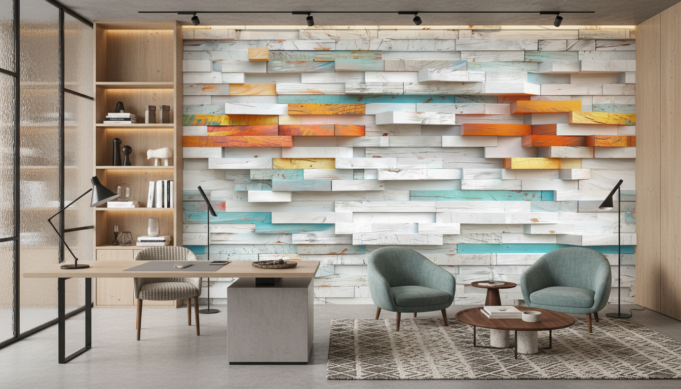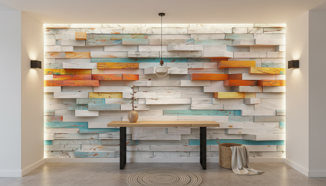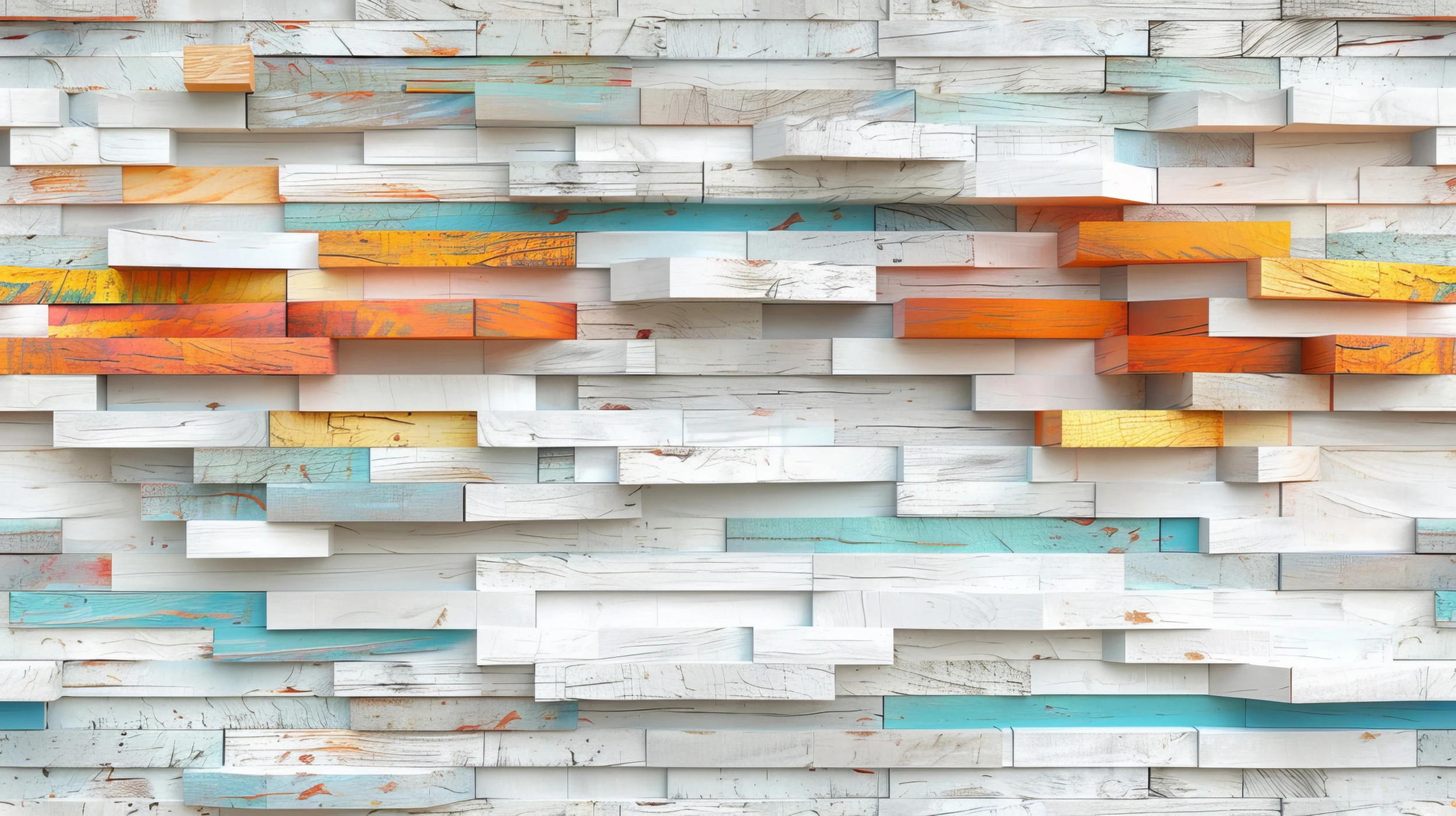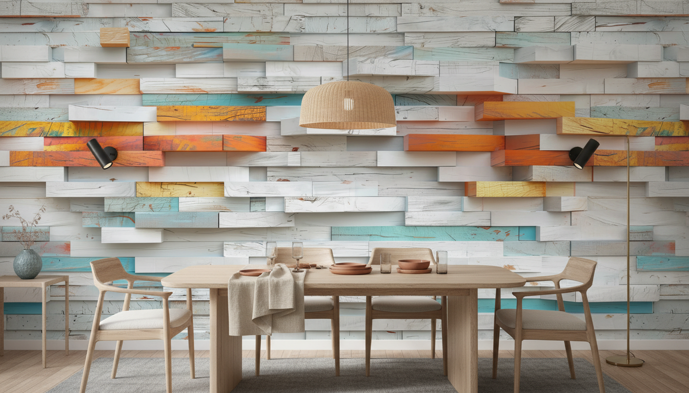 Papier peint effet bois 3D sur mesure pour un mur unique. Planches patinées colorées et relief saisissant. Créez une ambiance authentique, du style marin au loft moderne.