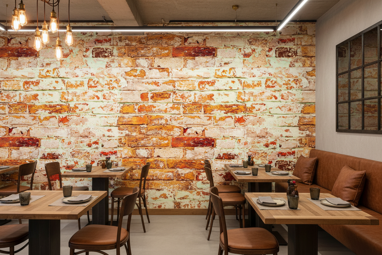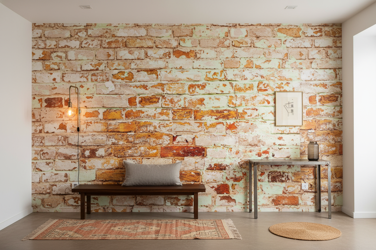 Côté associations déco, ce papier peint mur de briques vintage s’harmonise parfaitement avec des matériaux naturels comme le bois recyclé, l’acier brossé et les textiles en fibres brutes. Les tons neutres du mobilier – blanc cassé, gris anthracite, beige lin – créent un contraste élégant qui met en valeur la richesse chromatique de la surface. Des plantes vertes aux feuillages généreux apportent une fraîcheur contemporaine qui réveille cette base terreuse.