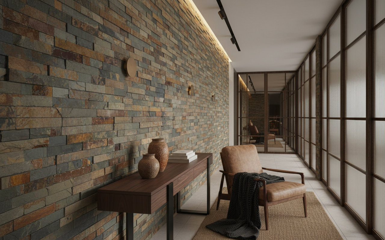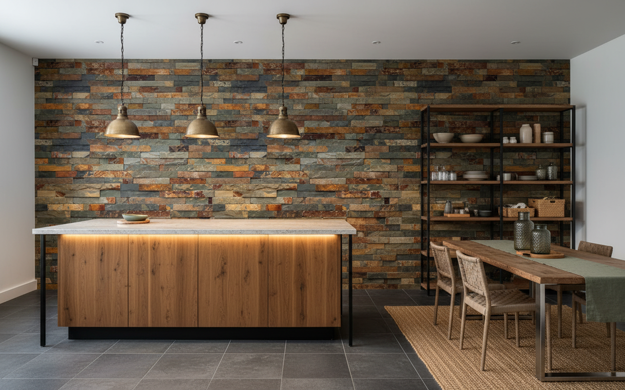 Ce papier peint style loft trouve naturellement sa place dans un salon contemporain où il créera un mur d’accent spectaculaire derrière un canapé en cuir vieilli ou une bibliothèque industrielle. Dans une chambre parentale, il apportera une touche de cocooning minéral particulièrement séduisante en tête de lit. Un bureau ou un espace de travail gagneront en caractère et en inspiration grâce à cette décoration murale effet pierre. Associez-le à du mobilier en bois brut, des éléments métalliques patinés, du lin naturel et des tons terreux pour créer une harmonie parfaite. Les luminaires industriels en métal noir ou cuivré viendront sublimer les reflets dorés de la pierre.