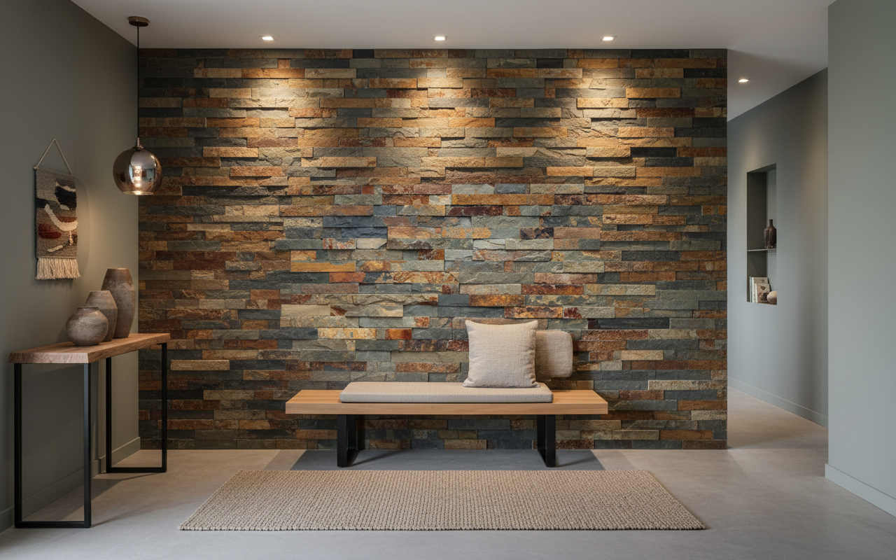 Ce papier peint effet pierre reproduit avec un réalisme saisissant un mur de briques en pierre naturelle aux tonalités multiples. Les nuances d’ocre doré, de rouille cuivrée et de gris anthracite se mêlent harmonieusement, créant un kaléidoscope minéral d’une richesse exceptionnelle. Chaque brique révèle sa propre personnalité : certaines arborent des veines dorées qui captent la lumière, d’autres dévoilent des patines oxydées aux reflets cuivrés, tandis que les plus sombres apportent une profondeur mystérieuse à l’ensemble. L’effet 3D de ce revêtement mural confère un relief saisissant qui joue avec les ombres et la lumière, créant l’illusion parfaite d’un véritable mur en pierre de parement.