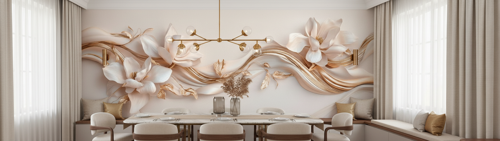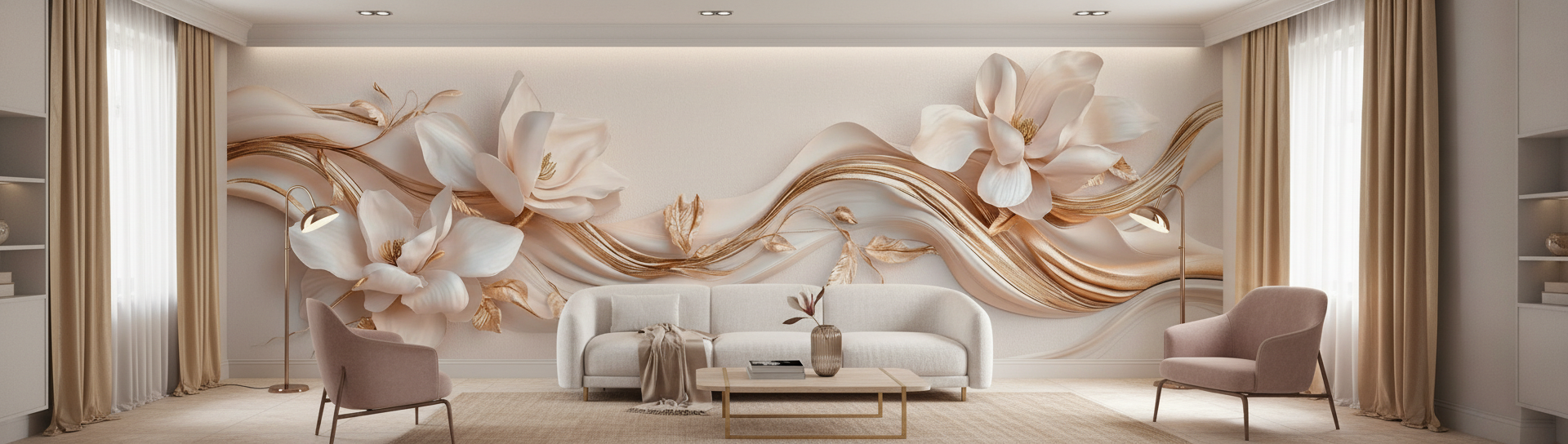 Pour une décoration murale sophistiquée, n’hésitez pas à intégrer des miroirs aux cadres dorés et des objets décoratifs en céramique blanche qui feront écho aux magnolias sculptés. Ce revêtement mural artistique s’accorde parfaitement avec les styles néoclassique, art déco moderne et luxury contemporain.