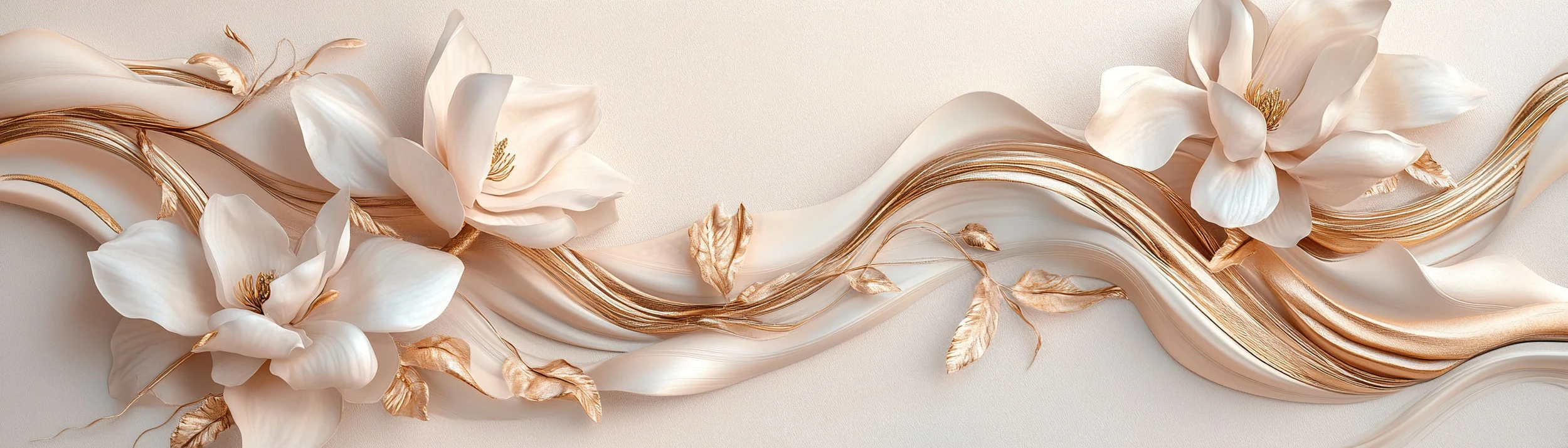 Ce papier peint floral élégant dévoile une symphonie visuelle d’une délicatesse rare, orchestrée autour de magnolias sculptés aux pétales d’un blanc nacré immaculé. Les fleurs en relief 3D semblent émerger de la surface dans une illusion saisissante, leurs corolles généreuses révélant des pistils dorés qui captent et reflètent subtilement la lumière. Des rubans métalliques dorés serpentent avec une fluidité hypnotique, créant des vagues sinueuses qui unifient la composition dans un mouvement perpétuel. Les feuilles dorées ciselées ponctuent cette chorégraphie végétale, apportant une dimension artisanale précieuse qui évoque l’art de l’orfèvrerie.