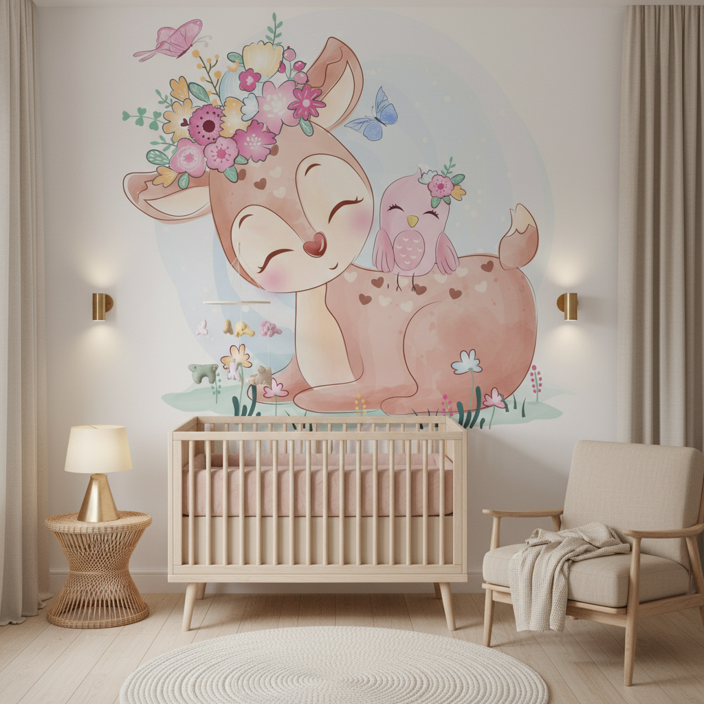 Les mots-clés qui définissent cette décoration murale sont : papier peint animaux, papier peint floral enfant, décoration chambre bébé, ambiance pastel, style scandinave moderne. Cette création s’inscrit parfaitement dans les tendances actuelles du design d’intérieur enfant, privilégiant les univers poétiques et les couleurs apaisantes.