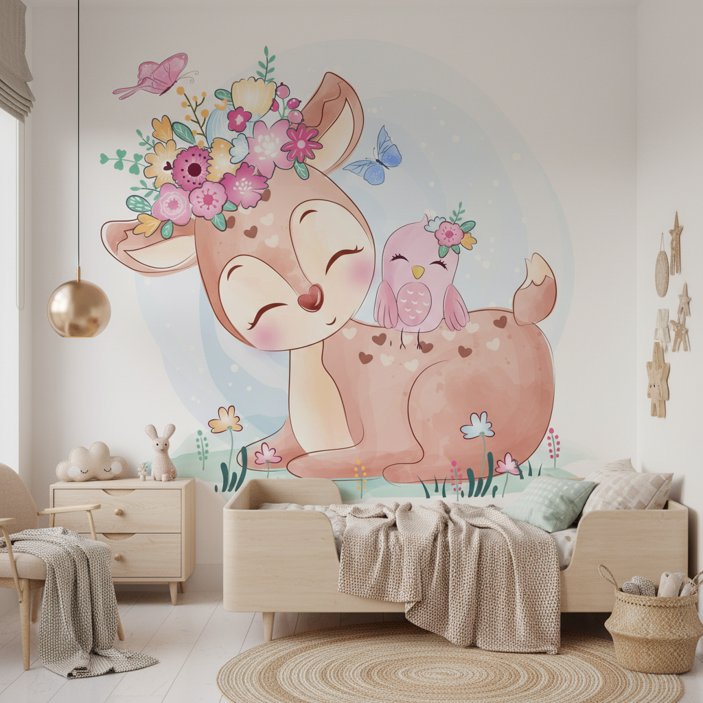 Cette création artistique sublime met en scène un adorable petit cerf aux tons rosés, orné d’une couronne de fleurs délicates aux nuances douces de rose, blanc et corail. Son expression paisible et ses yeux fermés de bonheur évoquent la sérénité absolue. Sur son dos se perche un charmant petit oiseau rose, lui aussi paré d’une mini-couronne florale, créant une harmonie parfaite entre ces deux compagnons. Des papillons colorés voltigent gracieusement autour d’eux, ajoutant une dimension aérienne et poétique à cette scène enchantée. Le style graphique, d’inspiration aquarelle moderne, offre des contours doux et des couleurs fondues qui rappellent l’art de l’illustration jeunesse contemporaine.