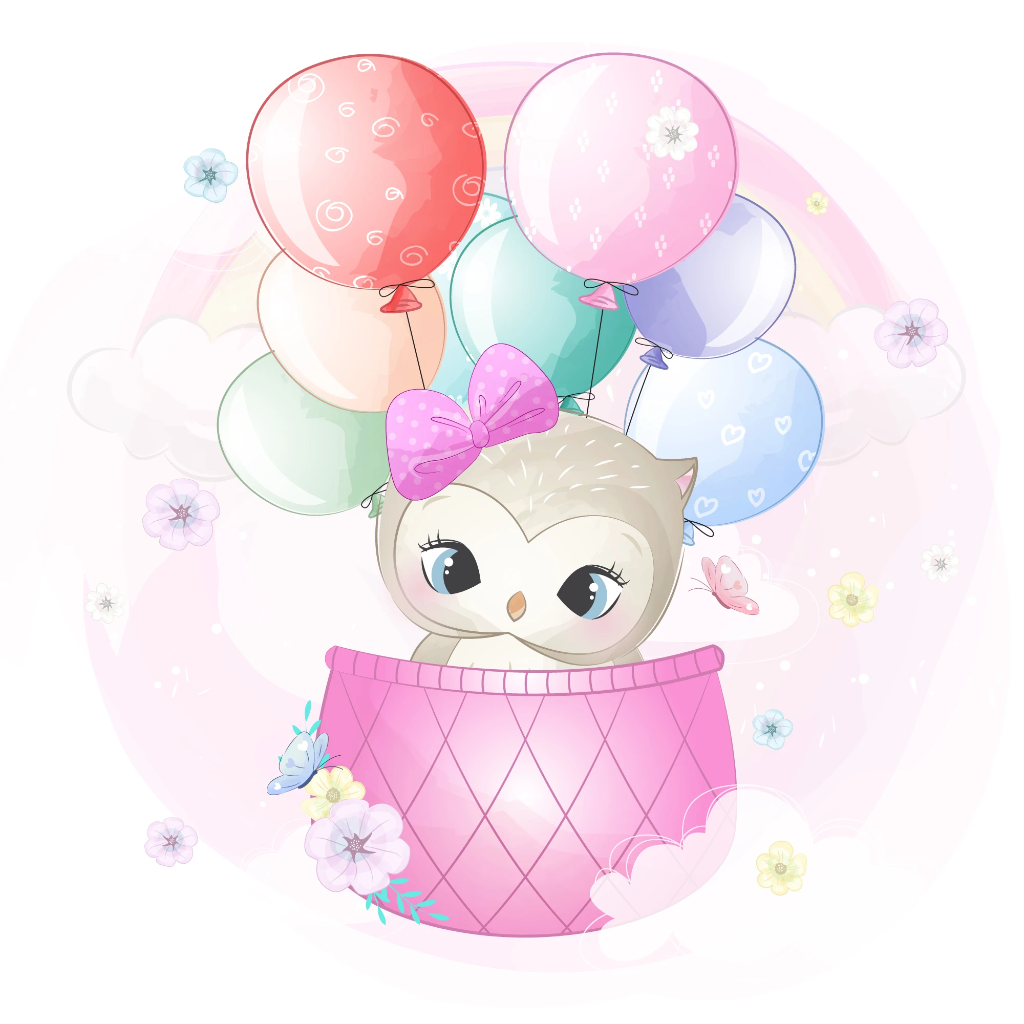 Au cœur de cette composition délicate, un hibou adorable aux grands yeux pétillants de malice trône majestueusement dans son panier rose tendre, orné de motifs géométriques raffinés. Sa petite tête couronnée d’un nœud rose bonbon évoque la tendresse absolue, tandis que ses plumes beiges et crème apportent une note naturelle apaisante. Une symphonie de ballons multicolores – rose coral, bleu ciel, vert menthe et lavande – s’élève gracieusement autour de lui, créant un mouvement ascendant plein de légèreté. Des fleurs délicates aux pétales translucides et des papillons cristallins parsèment l’ensemble, ajoutant une dimension poétique à cette scène enchantée.
