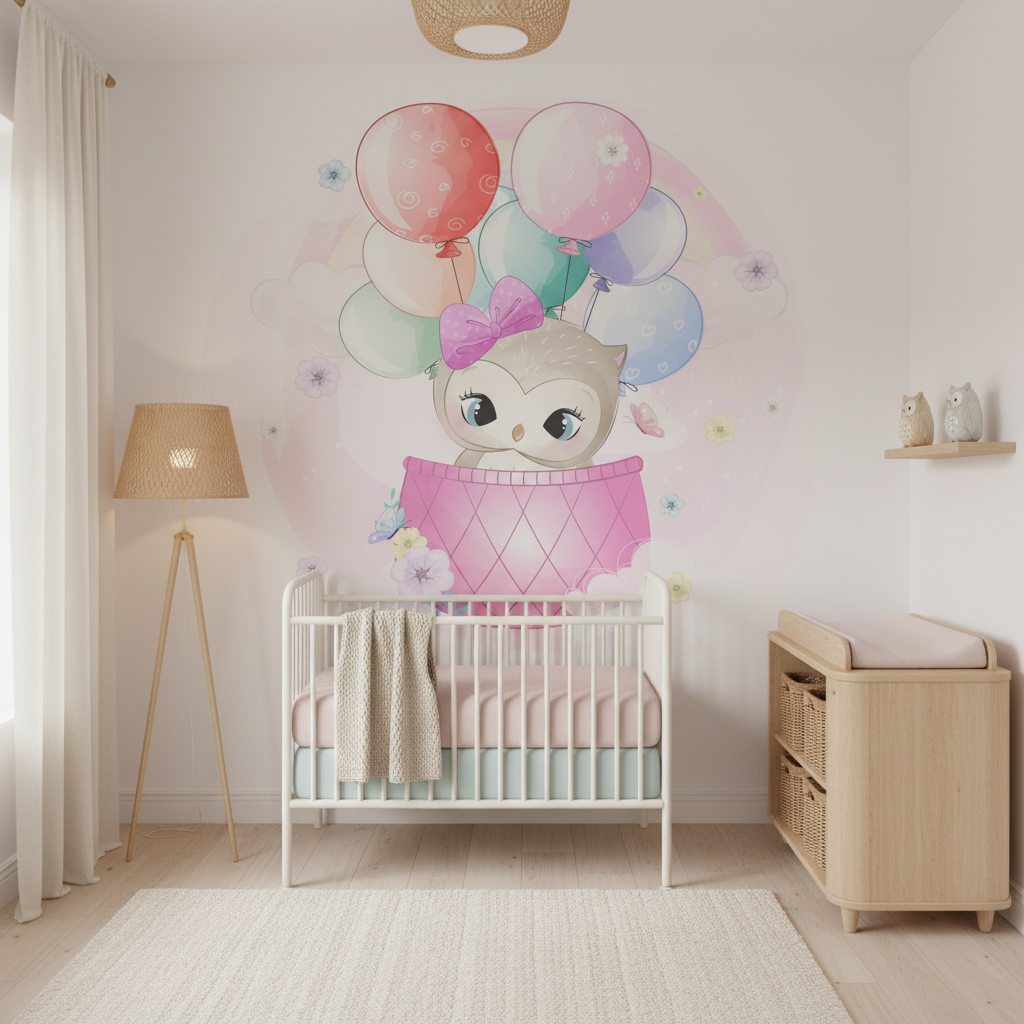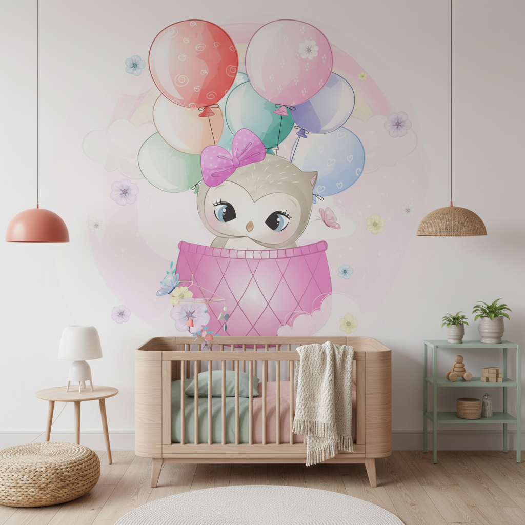Papier Peint Hibou Pastel – Univers Féérique et Ballons Colorés