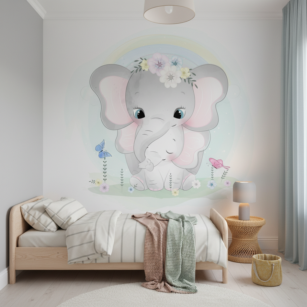 Ce papier peint enfant révèle un adorable bébé éléphant aux teintes poudrées, assis gracieusement dans un décor féerique et poétique. Son pelage gris tendre se pare d’oreilles délicatement rosées, tandis qu’une couronne florale multicolore orne sa tête avec élégance. Des fleurs aux nuances rose poudré, bleu ciel et blanc nacré s’épanouissent harmonieusement, créant une composition d’une douceur remarquable. Le petit éléphant enlace tendrement son bébé dans une étreinte protectrice, évoquant l’amour maternel le plus pur. L’arrière-plan se déploie en tons pastel aquarellés, mêlant des cercles colorés aux teintes arc-en-ciel qui enveloppent la scène d’une atmosphère onirique et apaisante. Des papillons colorés virevoltent autour de petites fleurs champêtres, complétant cette illustration au style aquarelle moderne.