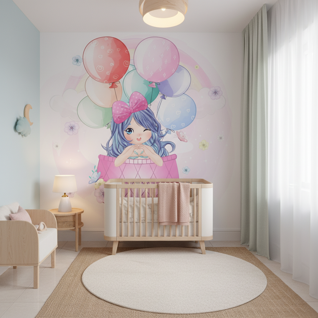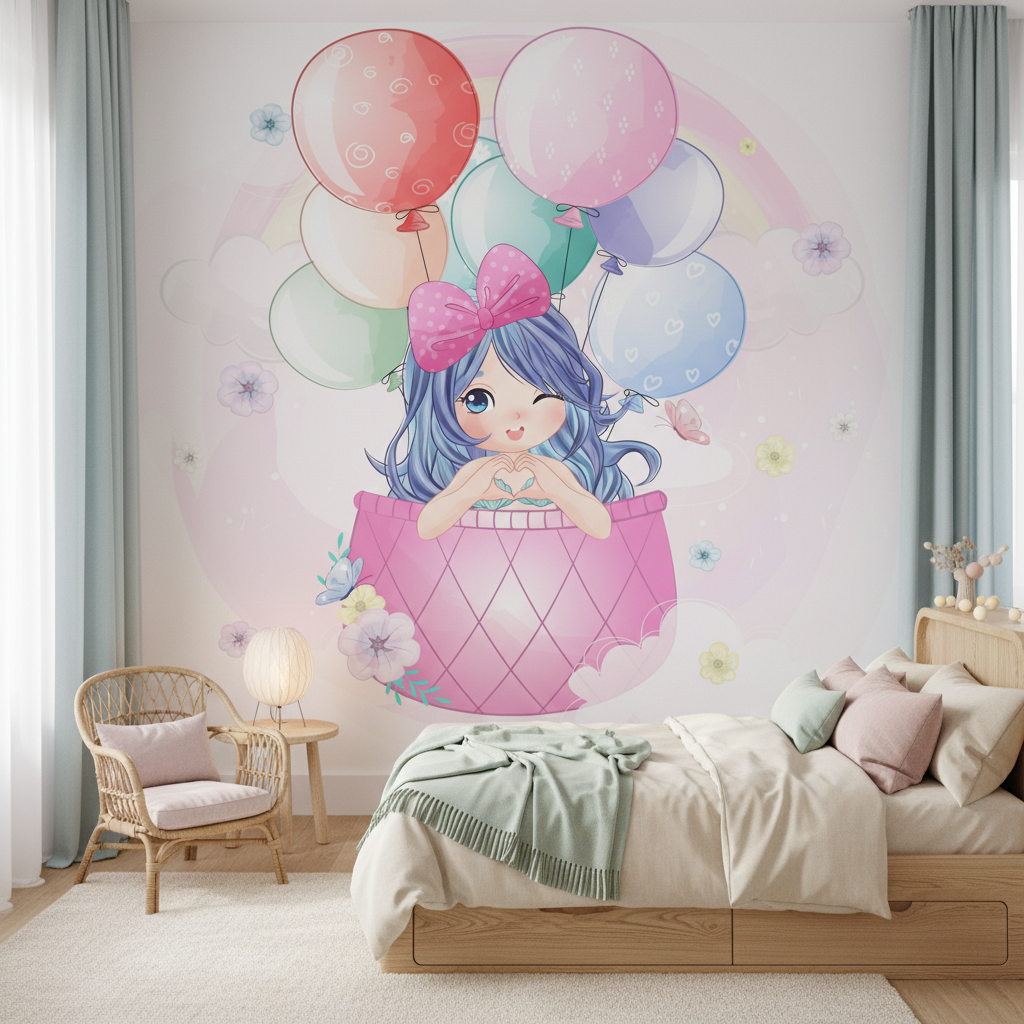 Ce papier peint enfant aux accents féeriques révèle une adorable petite fille aux cheveux bleus délicatement coiffés d’un nœud rose bonbon, s’élevant gracieusement dans un panier de montgolfière rose à motifs géométriques. Autour d’elle dansent une constellation de ballons colorés aux teintes poudrées – rose tendre, bleu ciel, vert menthe et corail délicat – chacun orné de motifs subtils qui captent la lumière avec une douceur cristalline. L’ensemble s’épanouit sur un fond pastel nuancé de rose et de mauve, parsemé de fleurs délicates et de papillons qui semblent voltiger dans cette atmosphère enchanteresse. Le style graphique, d’inspiration manga kawaii, mélange habilement l’art de l’illustration numérique avec une sensibilité aquarelle, créant des dégradés subtils et des transparences qui donnent vie à cette scène onirique.