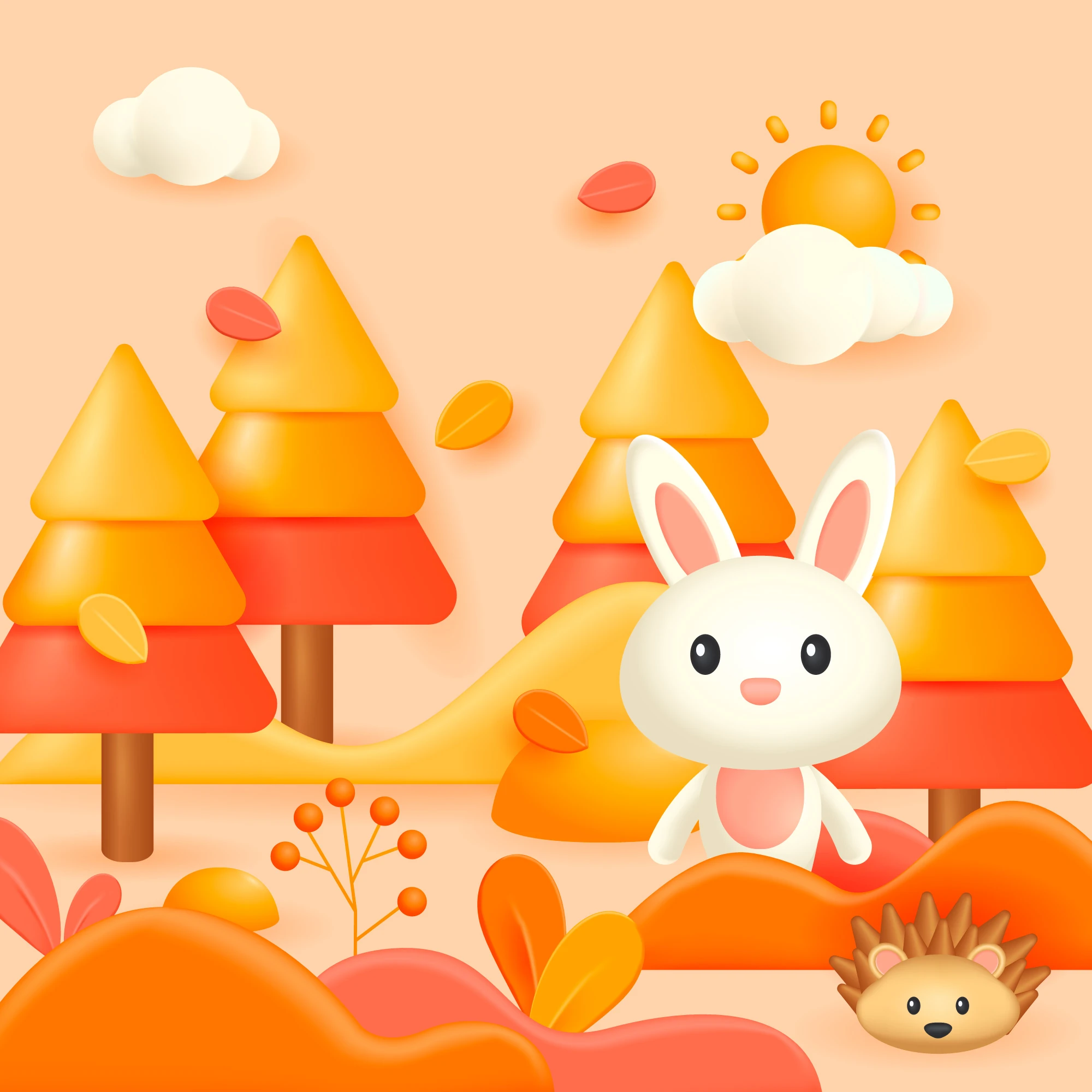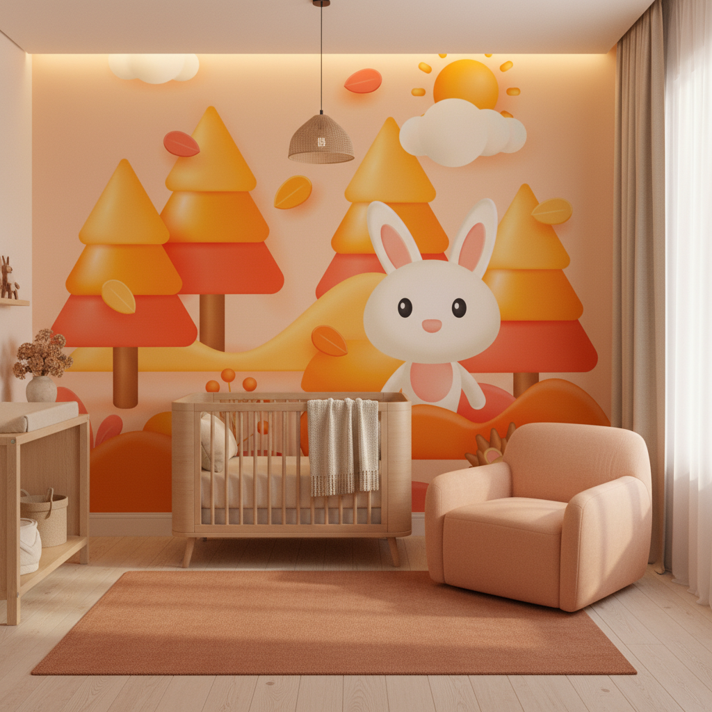 Ce papier peint enfantin déploie un paysage forestier stylisé d’une délicatesse infinie, où dominent les nuances orangées, dorées et corail dans un camaïeu harmonieux. Les arbres géométriques aux formes triangulaires superposées créent une forêt graphique moderne, tandis qu’un adorable lapin blanc aux oreilles roses se dresse fièrement au centre de cette composition poétique. Un petit hérisson brun complète cette faune attendrissante, apportant une note d’espièglerie à l’ensemble. Le soleil stylisé perce délicatement à travers les nuages cotonneux, baignant cette scène bucolique d’une lumière douce et rassurante. Les feuillages automnaux parsèment le décor, créant un tapis végétal aux tons cuivrés qui évoque la beauté des saisons qui passent.
