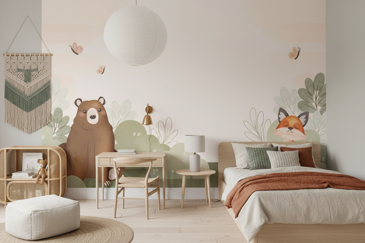 Offrez à votre intérieur cette fenêtre sur un monde où l’ours et le renard veillent tendrement sur les rêves les plus doux, où chaque papillon qui s’élève semble porter