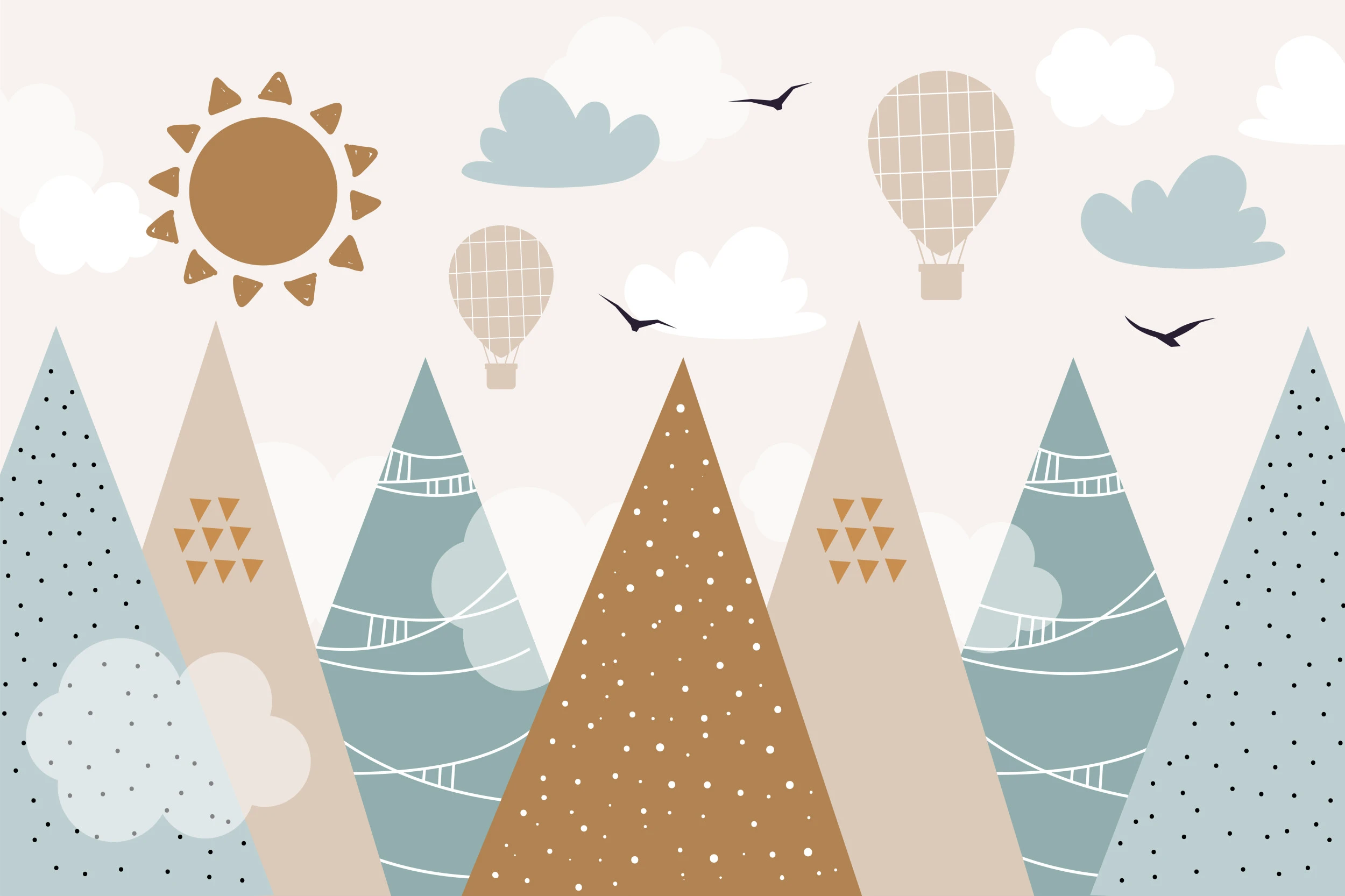 Ce papier peint enfant révèle un paysage enchanteur composé de montagnes géométriques aux teintes douces et harmonieuses. Chaque pic se dresse avec élégance, orné de motifs délicats : pois blancs scintillants, triangles dorés disposés avec précision, et lignes épurées qui serpentent comme des sentiers secrets. Les nuages cotonneux flottent avec grâce dans un ciel beige rosé, tandis que des montgolfières aux motifs quadrillés invitent au rêve et à l’aventure. Un soleil aux rayons triangulaires baigne cette scène d’une lumière dorée, et quelques oiseaux stylisés complètent cette composition poétique d’inspiration scandinave.