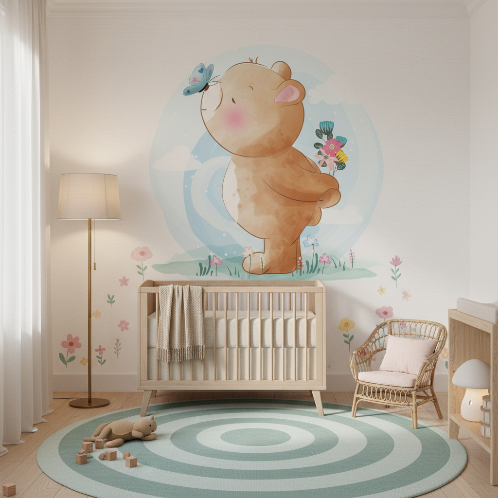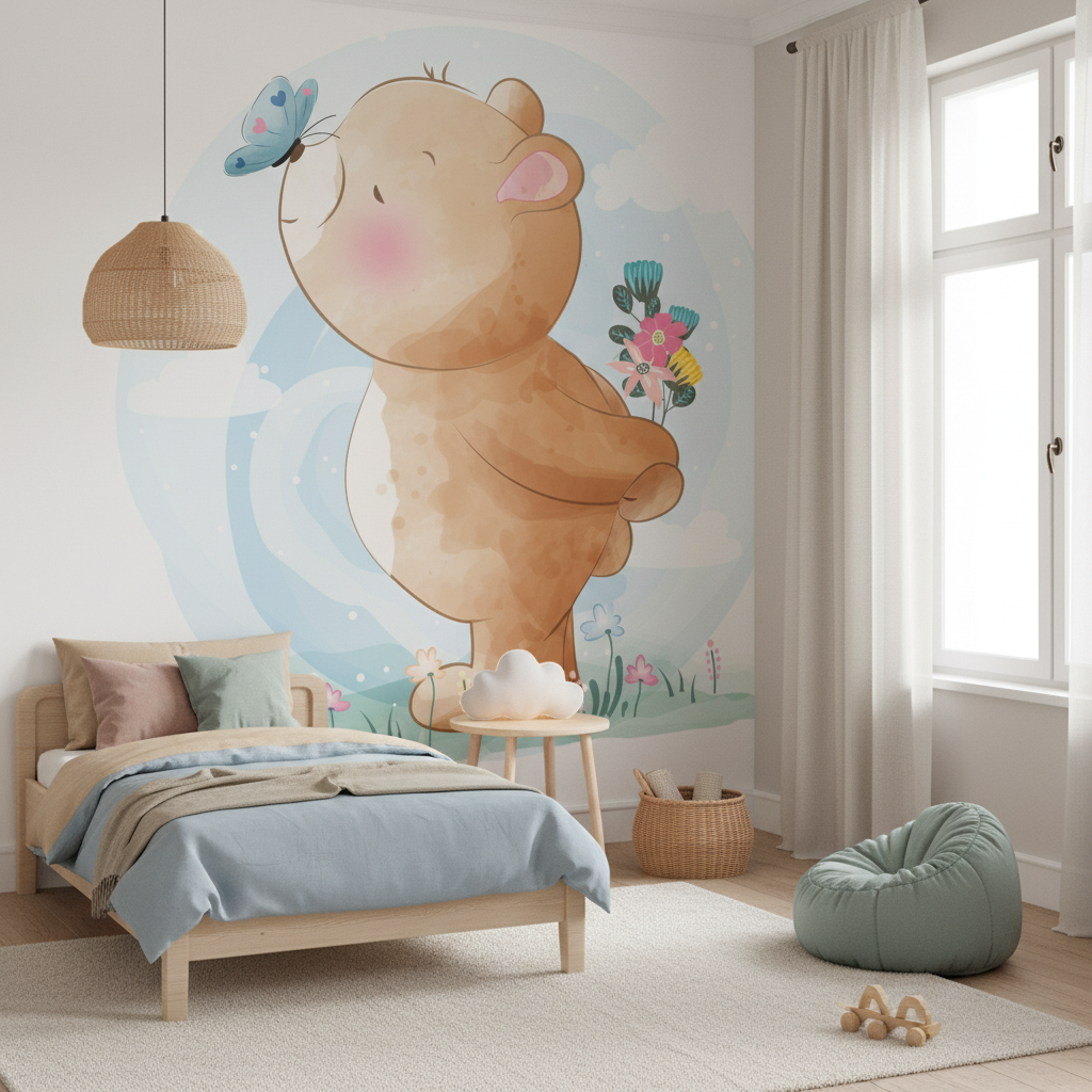 Papier Peint Enfant Ourson Mignon avec Papillon et Fleurs Colorées