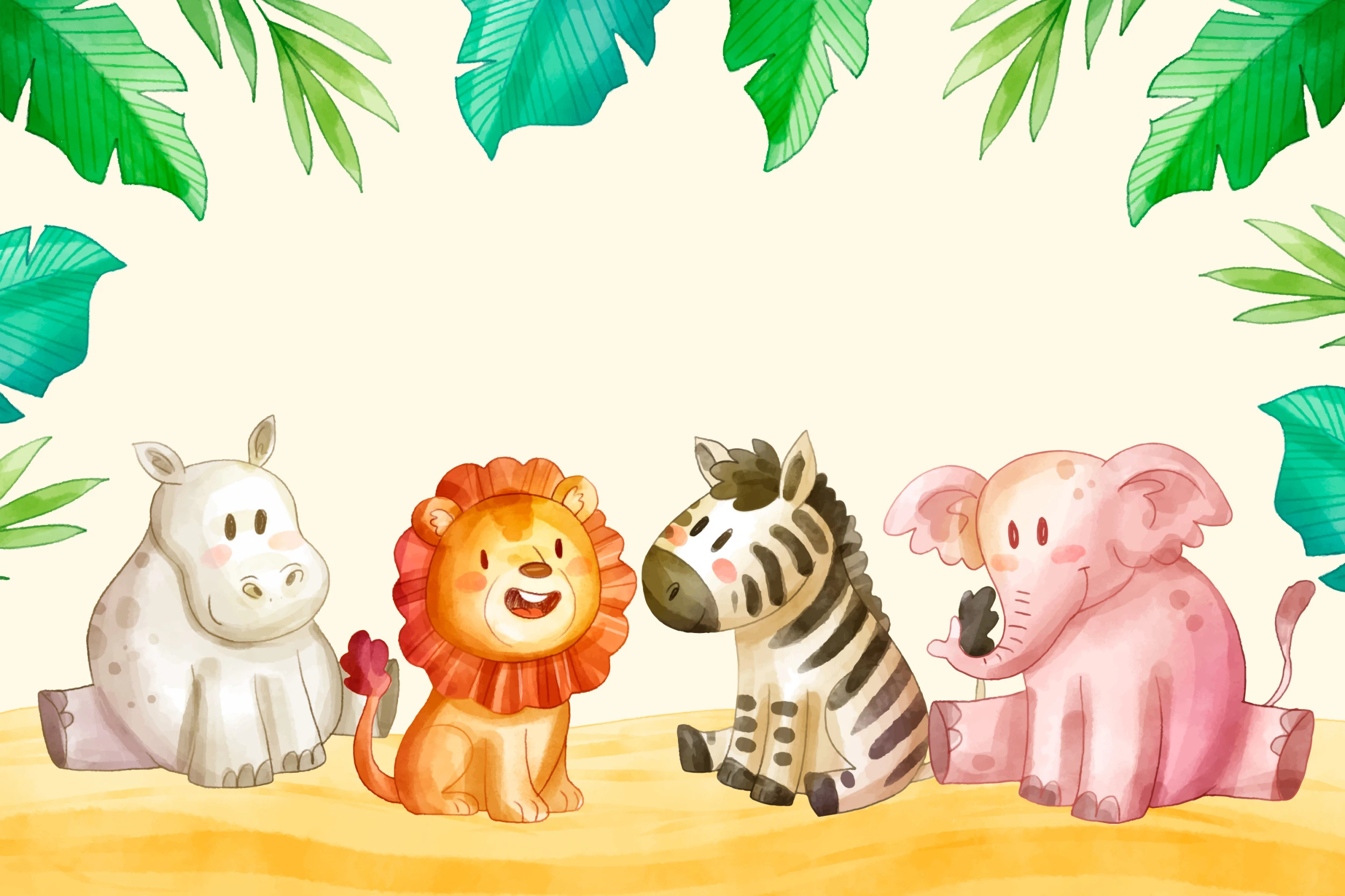 Cette création artistique dévoile une composition délicieusement équilibrée, mettant en scène un hippopotame gris aux joues rosées, un majestueux lion à la crinière flamboyante, un zèbre aux rayures expressives et un tendre éléphant rose aux oreilles délicatement ourlées. Chaque animal, rendu dans un style aquarelle délicat, exprime une personnalité unique à travers des traits arrondis et bienveillants. Les feuillages tropicaux qui encadrent cette scène amicale déclinent toute la palette des verts émeraude, jade et menthe, créant un écrin végétal d’une fraîcheur saisissante. Le fond crème ivoire apporte une luminosité naturelle qui sublime chaque détail de cette illustration enfantine.