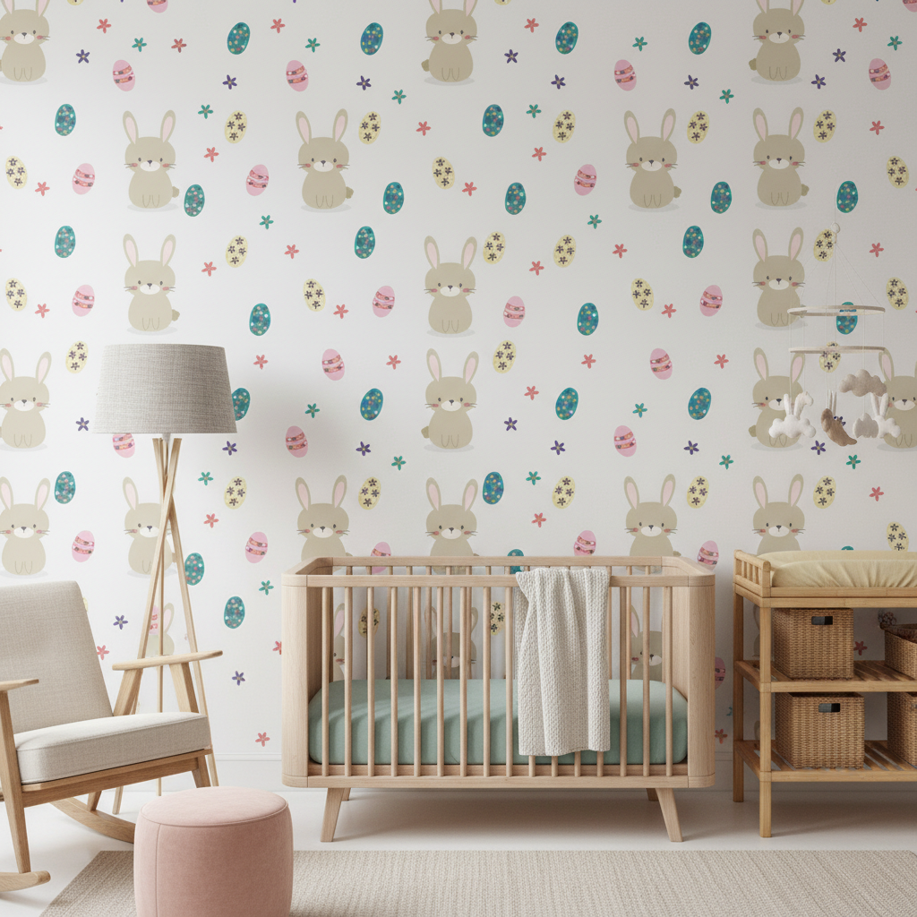 Dans l’univers tendre de Pâques, où la magie du renouveau s’épanouit en douceur, ce papier peint enfantin déploie un ballet enchanteur de lapins adorables et d’œufs colorés sur un fond délicat aux nuances poudrées.