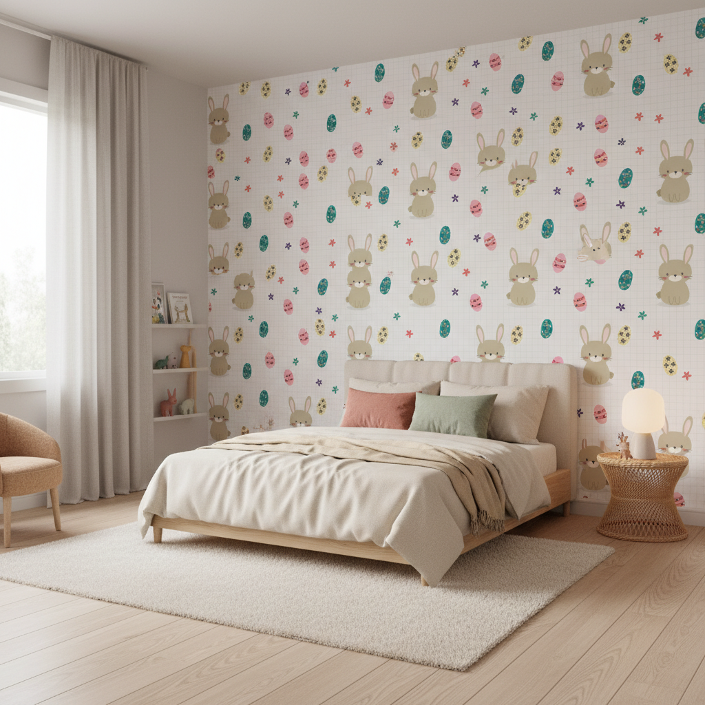 Ce papier peint thématique Pâques trouve naturellement sa place dans une chambre de bébé ou une chambre d’enfant, où il transformera les murs en un véritable livre d’histoires murales. Pour une décoration harmonieuse, associez-le à du mobilier en bois clair – chêne blanchi ou pin naturel – et à du linge de maison en lin blanc ou en coton rose poudré. Des accessoires en osier tressé, quelques coussins aux tons vert amande et des luminaires en rotin naturel parachèveront cette ambiance scandinave douce. Dans un salon familial ou une salle de jeux, ce revêtement mural apportera une note de fraîcheur printanière particulièrement bienvenue.