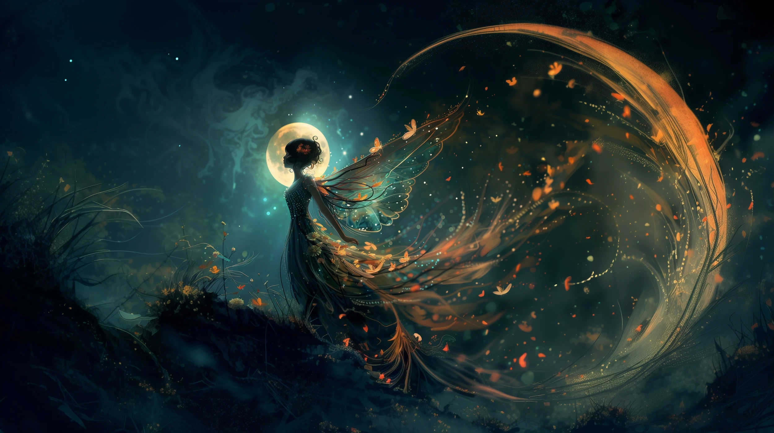 Ce papier peint fantastique révèle une œuvre d’art numérique d’une beauté saisissante, où une fée ailée aux cheveux sombres se dresse dans un tourbillon cosmique. La créature mythique, auréolée d’un halo lunaire, déploie ses ailes délicates ornées de motifs dorés scintillants qui semblent vibrer dans l’obscurité. Son kimono flottant aux nuances cuivrées et orangées se mêle harmonieusement aux particules lumineuses qui l’entourent, créant un ballet céleste hypnotisant.