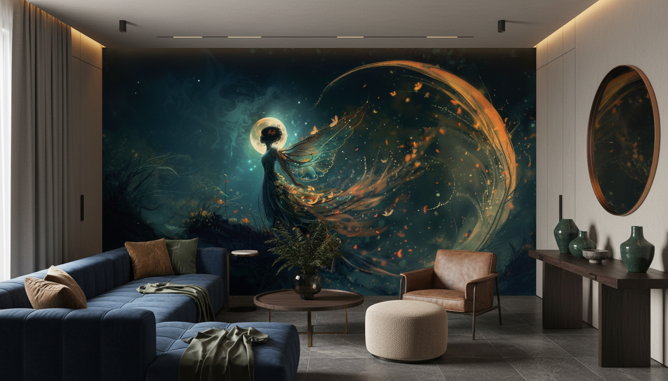 Ce papier peint artistique trouve sa place idéale dans une chambre parentale en tant que tête de lit spectaculaire, transformant l’espace en un sanctuaire de détente. Dans un salon contemporain, posé sur un mur d’accent, il créera un point focal saisissant qui invite à la méditation. Pour un bureau créatif, cette œuvre inspirante stimulera l’imagination et la créativité. Associez-le à du mobilier en bois sombre, des textiles en velours bleu nuit ou des accessoires en laiton doré pour créer une harmonie parfaite. Des touches de cuivre et des éclairages tamisés compléteront magnifiquement cette ambiance mystique.