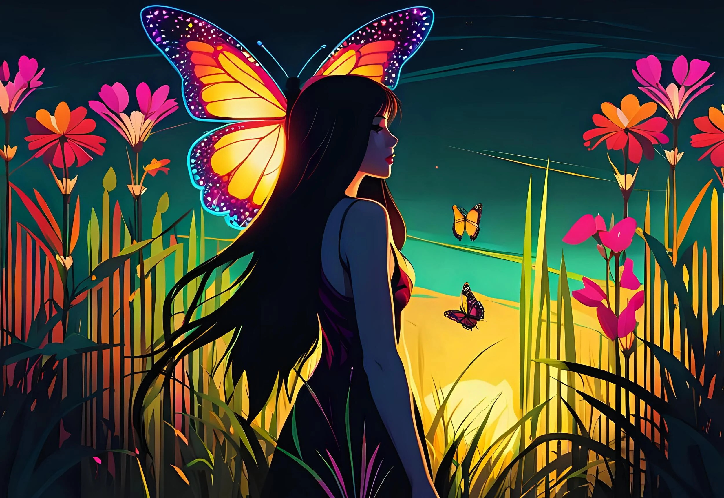 Cette création graphique d’exception dévoile une illustration digitale raffinée aux accents fantastiques. Au cœur de la composition, une figure féminine élégante se profile, ornée de grandes ailes de papillon aux nuances flamboyantes d’orange, de jaune et de violet profond, ponctuées de délicats points lumineux. Autour d’elle s’épanouit une végétation luxuriante stylisée : des fleurs aux pétales rose fuchsia et corail se dressent fièrement sur leurs tiges élancées, tandis que des herbes hautes dorées et des feuillages aux tons vert jade créent un écrin végétal somptueux.