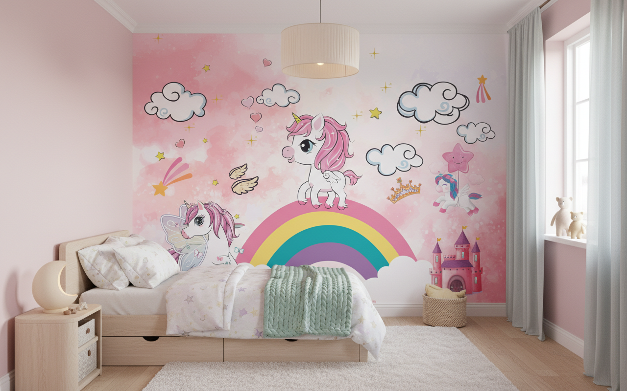 Plongez dans un royaume enchanté où licornes et étoiles scintillantes dansent au cœur d’un ciel pastel teinté de rêves et de tendresse, transformant instantanément votre intérieur en un sanctuaire féérique aux mille promesses d’évasion.