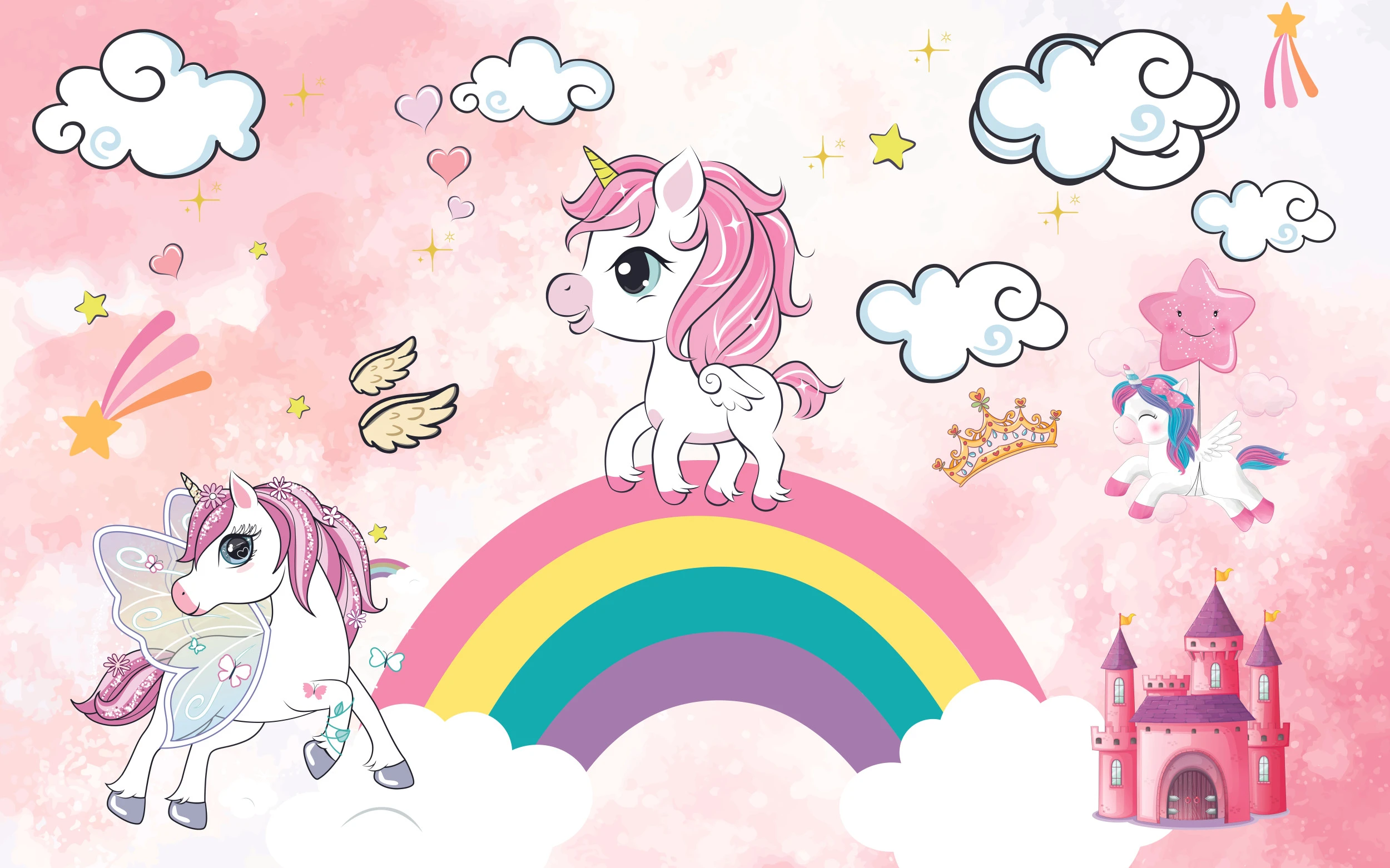 Ce papier peint licorne déploie un univers graphique d’une délicatesse infinie, orchestré autour de trois majestueuses licornes aux crinières ondulantes dans des tons de rose poudré et de violet pastel. L’une d’elles, ornée d’une couronne dorée, trône fièrement sur un arc-en-ciel multicolore aux bandes rose, jaune, turquoise et violette, symbole d’espoir et de magie. Le style graphique, d’inspiration kawaii et cartoon, mélange harmonieusement des traits nets et des ombrages subtils, créant un rendu à la fois moderne et intemporel.