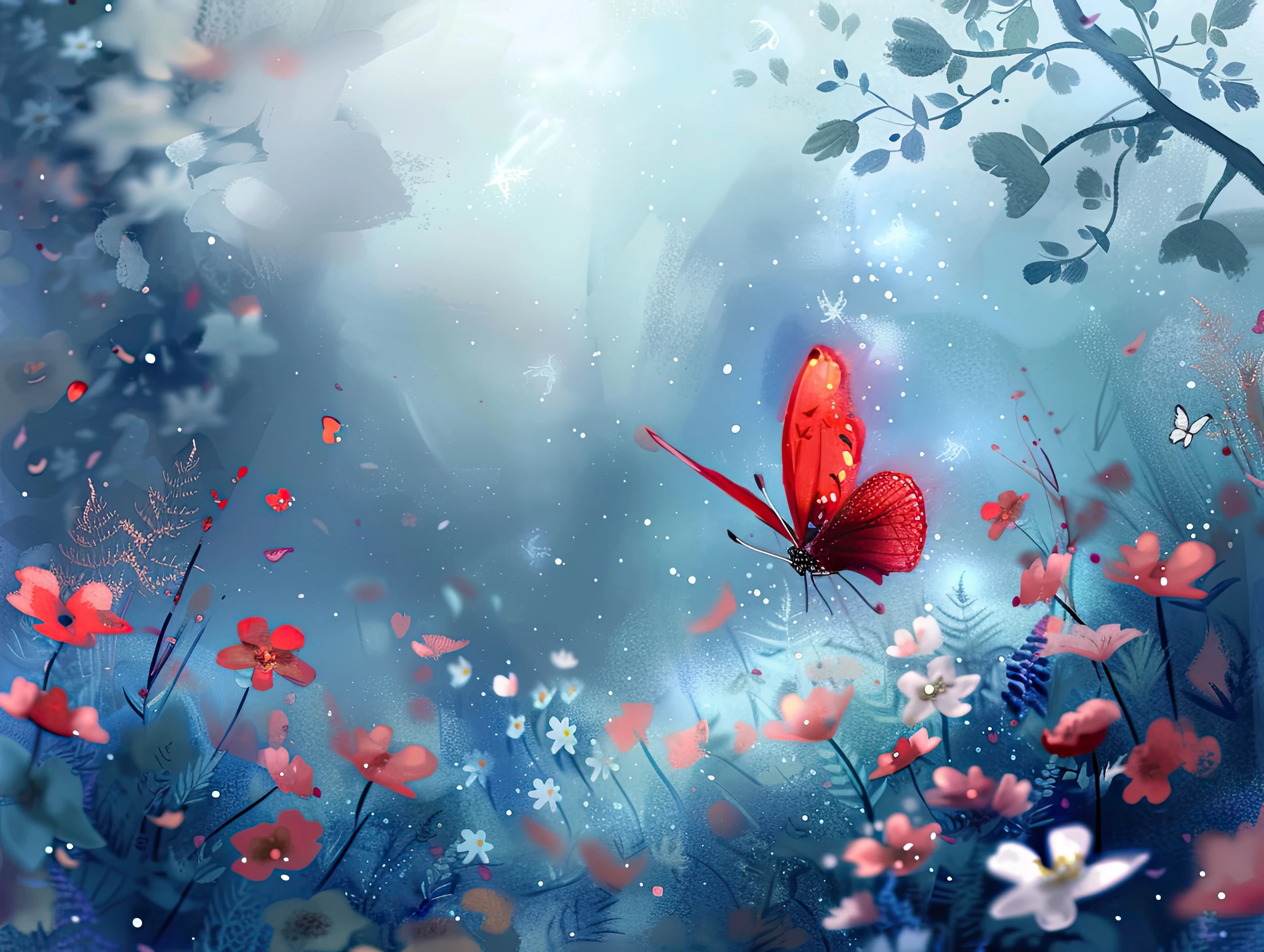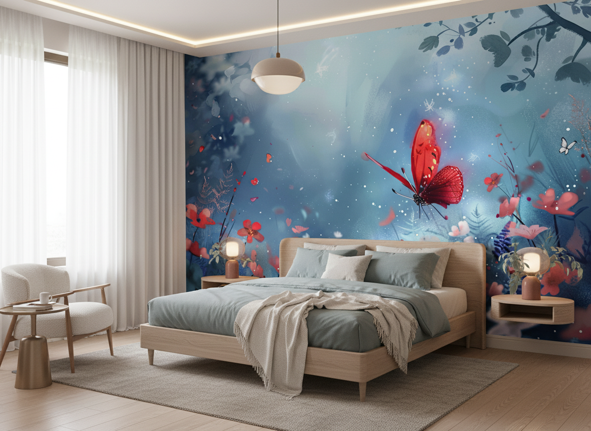 Ce papier peint artistique révèle un jardin enchanté baigné dans une atmosphère vaporeuse aux nuances bleu-gris sublimes. Au cœur de cette composition onirique, un papillon rouge écarlate aux ailes délicatement nervurées virevolte parmi une symphonie de fleurs stylisées aux teintes coral et rose tendre. Les motifs floraux aquarellés s’épanouissent avec une grâce naturelle, tandis que de fines branches végétales aux feuillages vert-de-gris créent une trame organique sophistiquée.