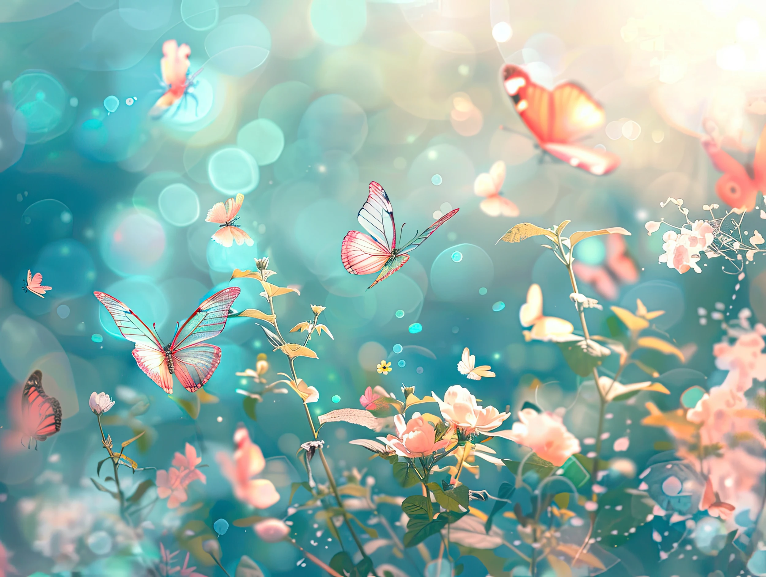 Ce papier peint nature d’exception révèle un univers enchanteur où dominent les papillons aux ailes délicates, parés de nuances roses, bleues et corail qui scintillent comme des joyaux précieux. Les fleurs roses tendres s’épanouissent harmonieusement au premier plan, tandis qu’un feuillage vert doré apporte une profondeur naturelle à la composition. L’ensemble baigne dans une atmosphère lumineuse aux tons turquoise et dorés, ponctuée d’effets bokeh qui créent une sensation de mouvement perpétuel et de magie pure.