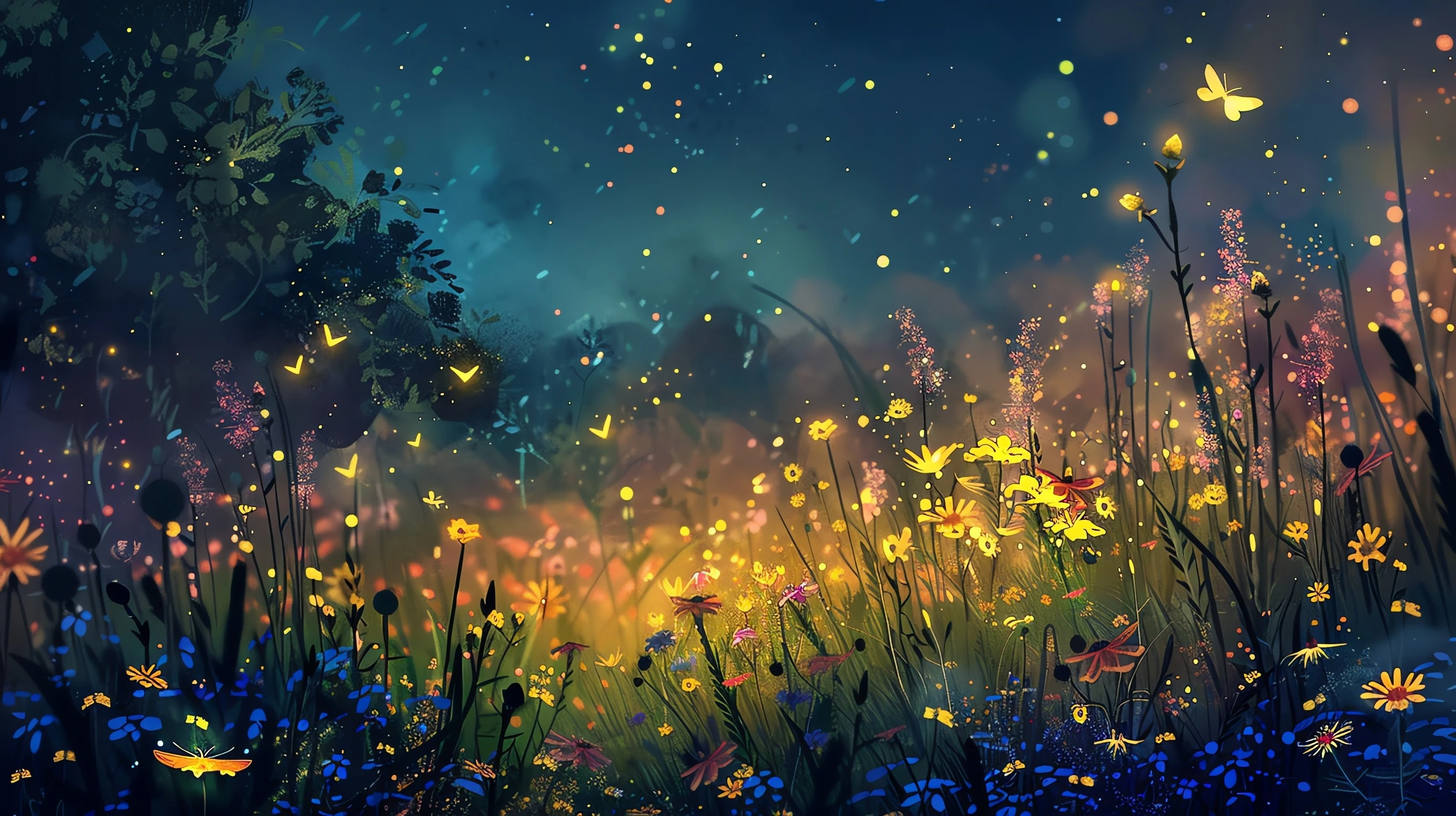 Quand la nuit tombe sur la prairie, une magie lumineuse s’éveille, transformant chaque brin d’herbe en théâtre d’un ballet féerique où dansent lucioles et papillons dorés.