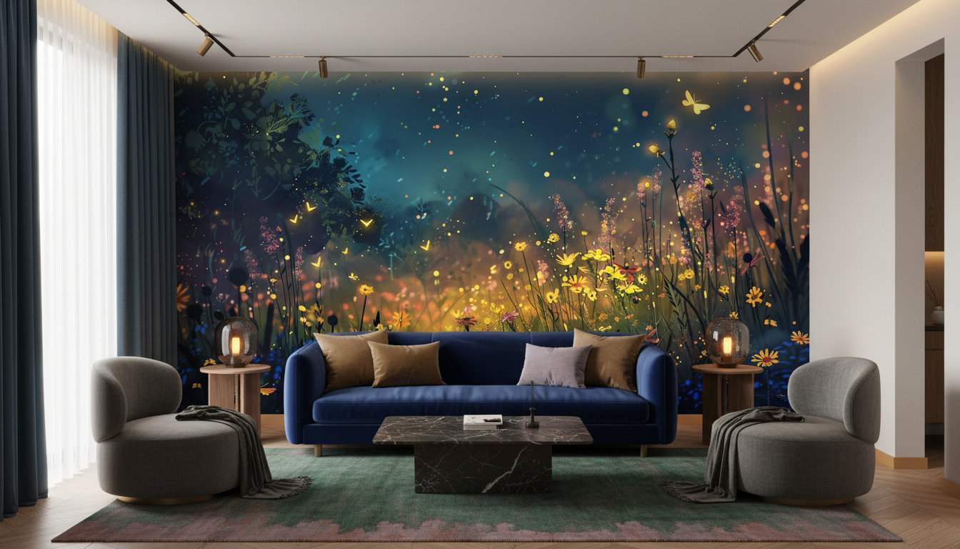 Ce papier peint enchanteur capture avec une délicatesse artistique exceptionnelle l’essence même d’une prairie nocturne illuminée. Dans un style qui évoque la peinture numérique contemporaine, cette création dévoile un univers onirique où se mêlent harmonieusement fleurs sauvages, graminées élancées et végétation luxuriante. Les tons bleus profonds du ciel crépusculaire se fondent subtilement avec les nuances dorées et orange chaleureuses qui baignent la végétation. Des particules luminescentes parsèment l’ensemble, créant un effet de poudre d’étoiles qui sublime chaque détail botanique.