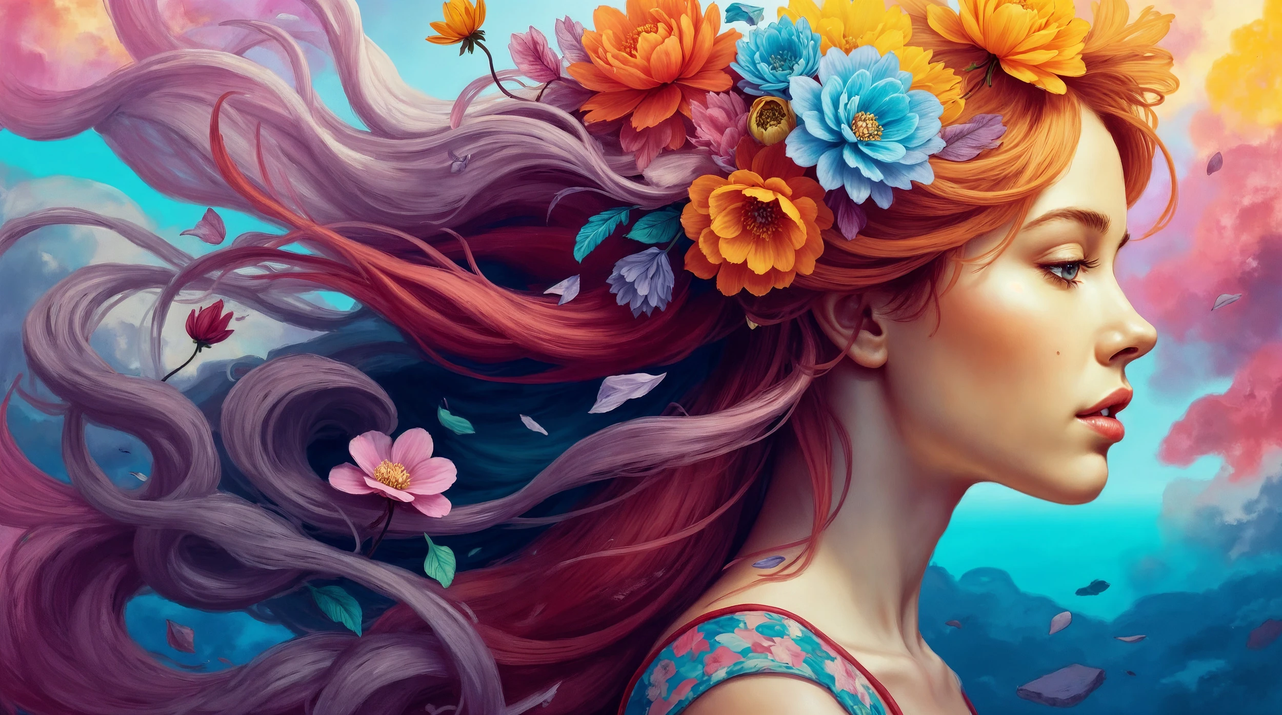 Ce papier peint artistique dévoile le profil délicat d’une femme aux cheveux ondulants teintés de nuances pourpres et cuivrées, pareils à une cascade de soie dans le vent. Sa chevelure se transforme en jardin secret où s’épanouissent des fleurs multicolores d’une beauté saisissante : dahlias orange éclatants, cosmos bleus azur, pivoines roses poudrées et tournesols dorés. Ces fleurs fantastiques semblent danser dans ses mèches, accompagnées de feuillages délicats et de pétales voltigeant dans l’air.