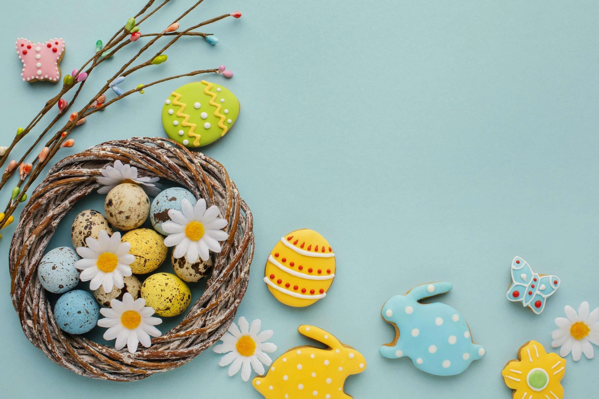 La magie opère également à travers une collection de biscuits décoratifs aux formes emblématiques : lapins de Pâques en jaune et bleu ciel, œufs ornementés de motifs géométriques délicats, et papillons aux ailes parsemées de pois colorés. Ces éléments, traités dans un style artisanal contemporain, créent une symphonie visuelle où se mêlent tradition et modernité. Les marguerites blanches au cœur doré parsèment cette scène bucolique, apportant une fraîcheur florale incomparable.