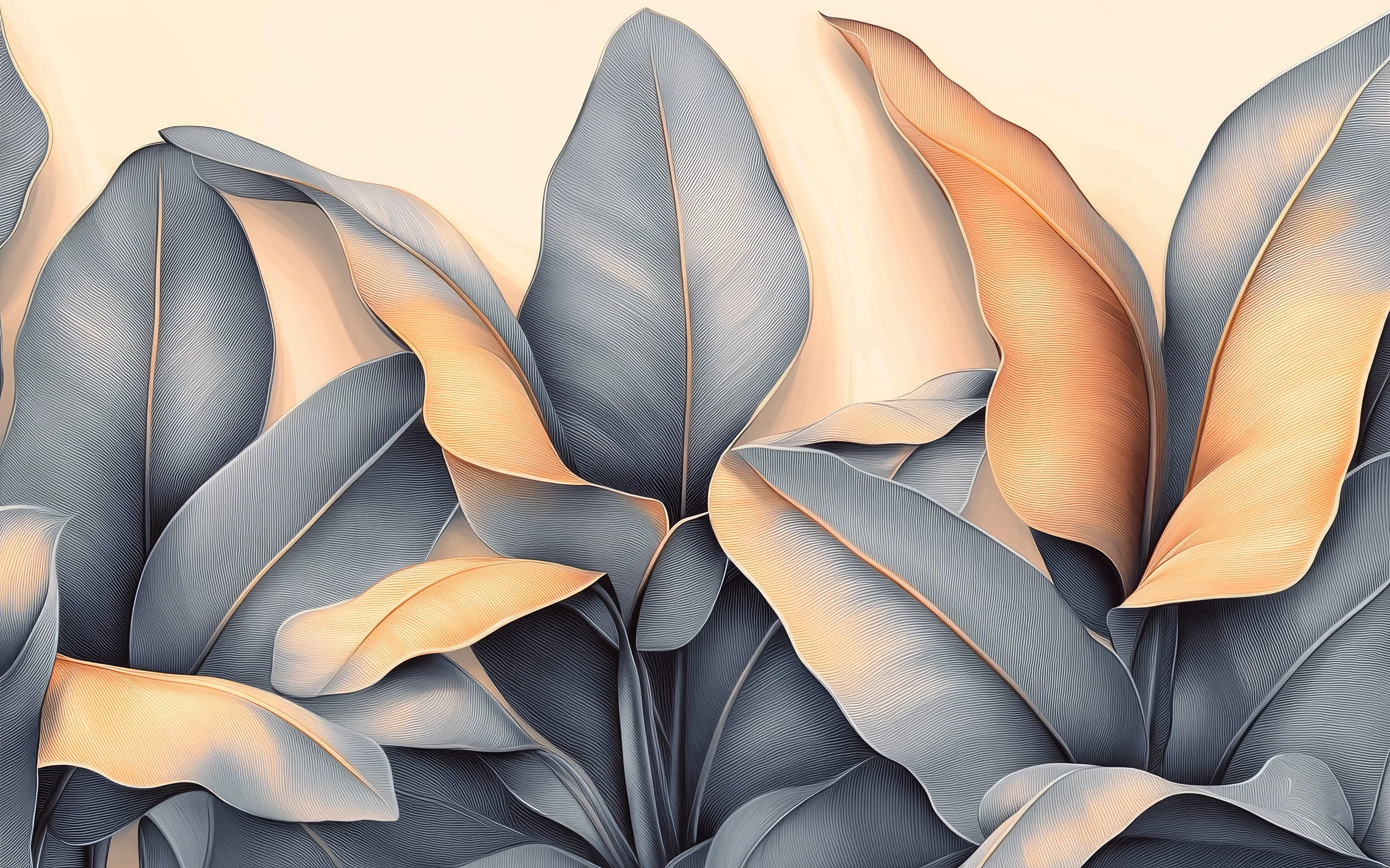 Cette création artistique révèle un motif de feuillages stylisés aux courbes généreuses et sensuelles. Les feuilles tropicales se déclinent dans une palette raffinée alliant gris anthracite et nuances cuivrées, créant un contraste saisissant sur un fond crème nacré. Le style graphique, d’une élégance contemporaine, évoque la technique de l’illustration vectorielle avec ses lignes fluides et ses dégradés subtils.