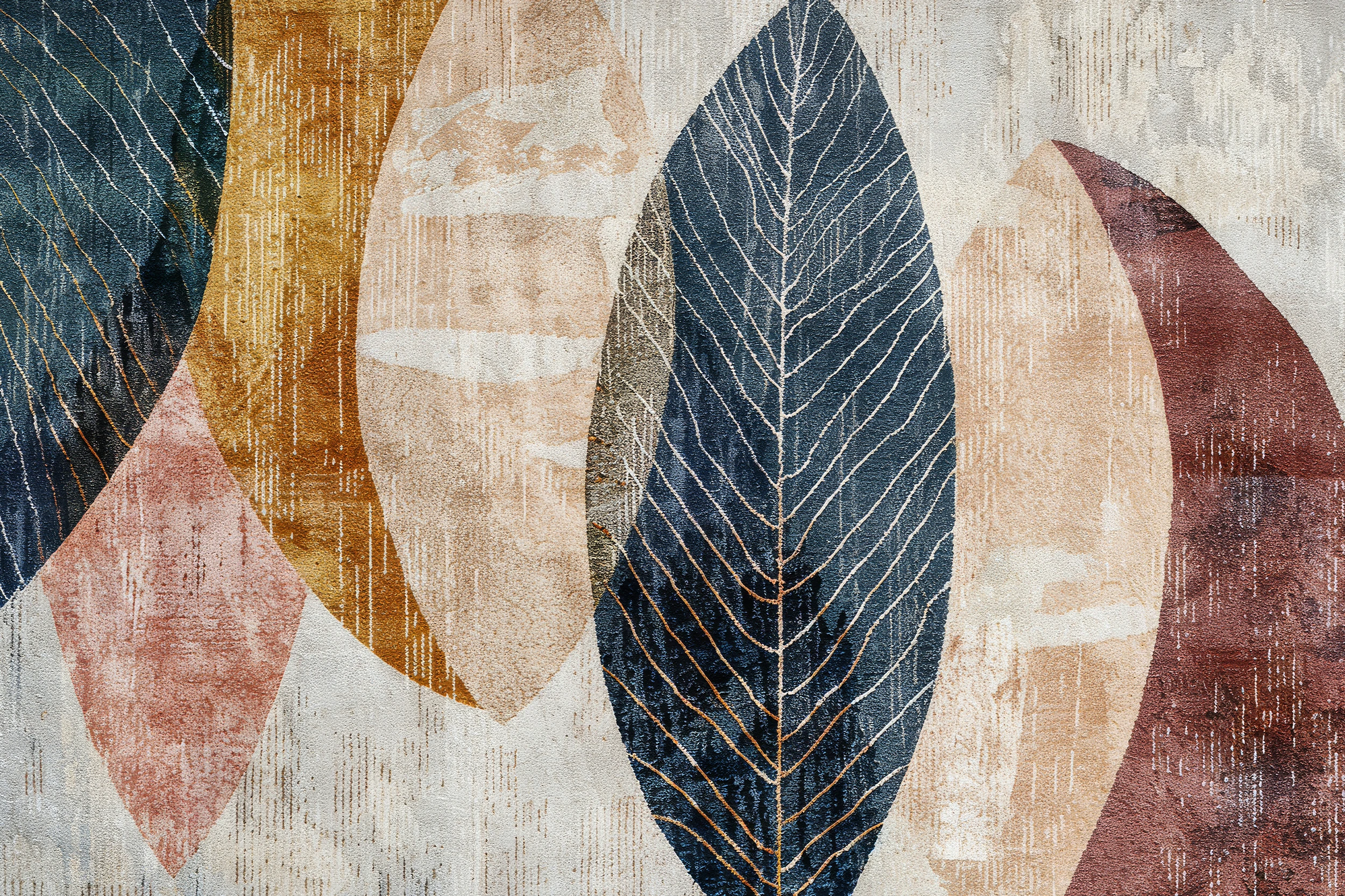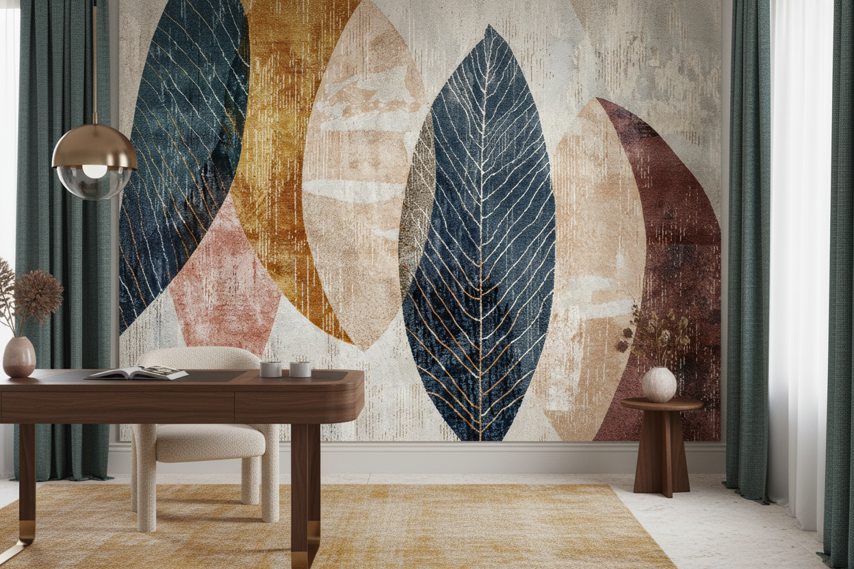 Ce papier peint contemporain révèle un univers graphique d’une rare sophistication, composé de feuilles tropicales aux nervures délicatement dorées qui se détachent sur un fond aux tons naturels. Les motifs végétaux se déploient dans une palette chromatique raffinée, oscillant entre les bleus profonds, les ocres chaleureux, les roses poudrés et les burgundy élégants. Cette composition graphique évoque un art déco moderne, où chaque élément semble avoir été pensé comme une œuvre d’art murale.