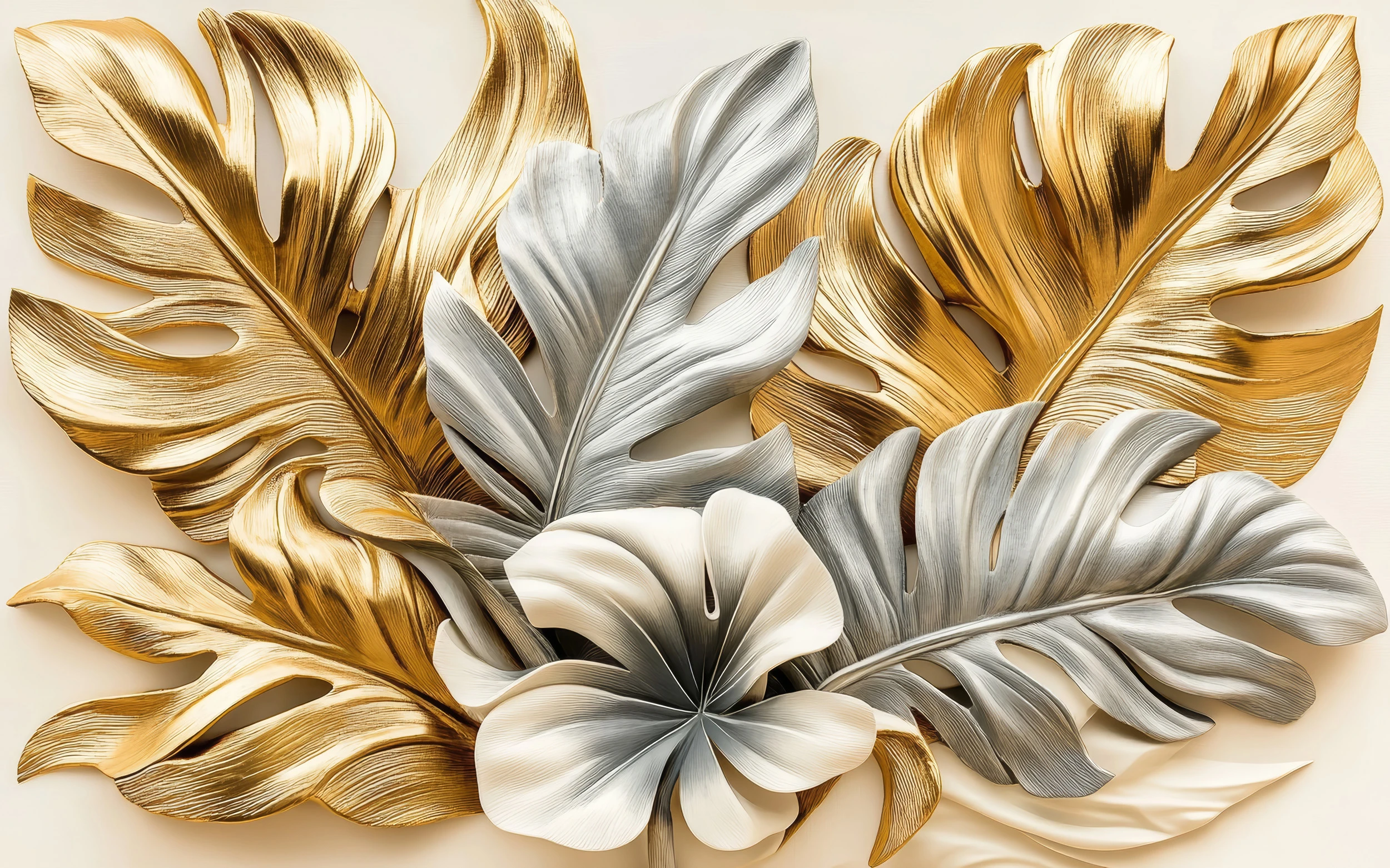 Ce papier peint tropical luxueux révèle un jardin d’éden stylisé aux accents précieux, composé de feuilles de monstera dorées et de palmes argentées aux découpes sophistiquées. Chaque élément végétal semble ciselé dans le métal le plus noble, créant un relief tridimensionnel saisissant qui captive la lumière. Les motifs tropicaux dorés s’entremêlent harmonieusement avec des nuances argentées chatoyantes et des tons blanc nacré, sublimés par des reflets cuivrés qui réchauffent l’ensemble. Le style graphique évoque l’art du travail du métal précieux, transformant la nature tropicale en véritable décoration murale sculptée.