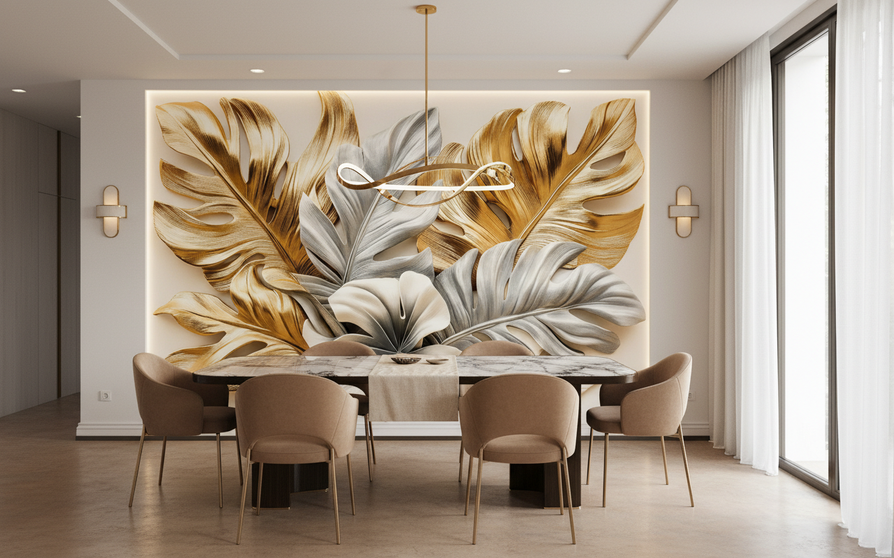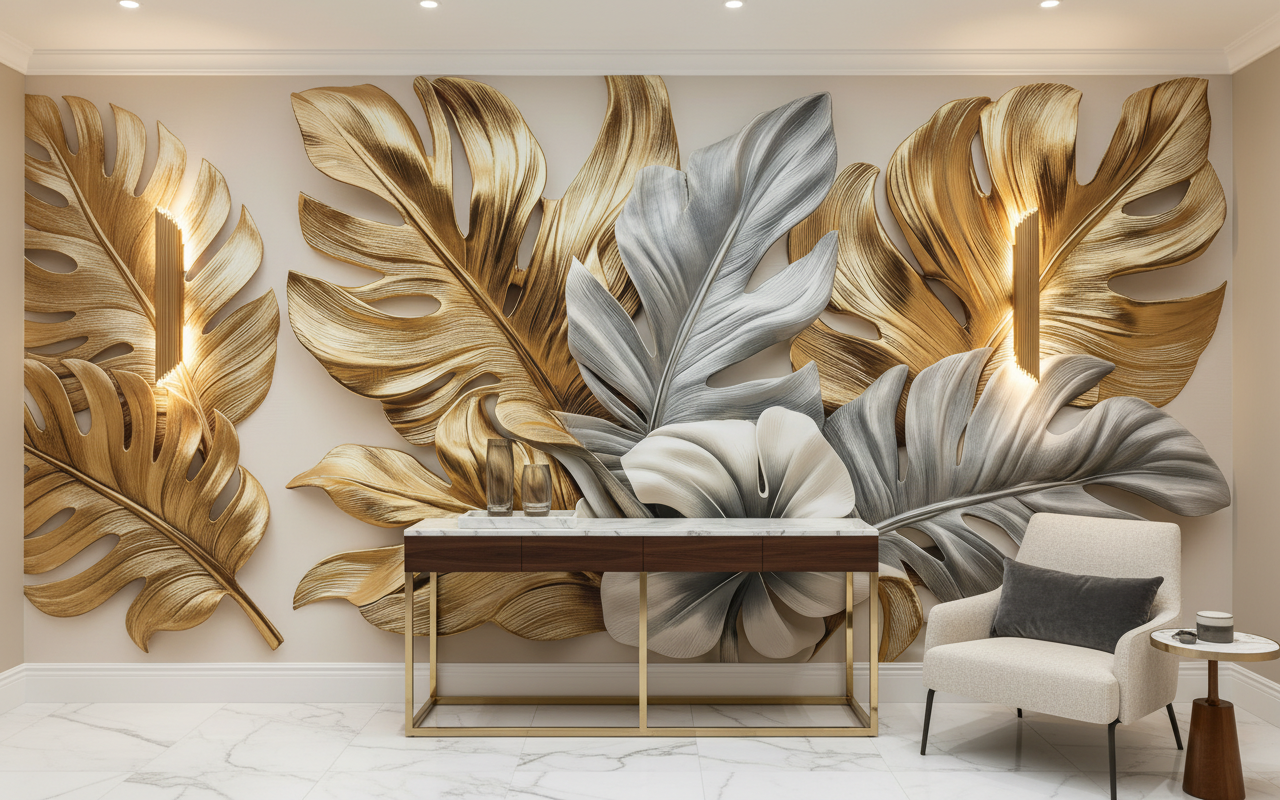 Laissez-vous envoûter par cette symphonie de feuillages métalliques qui danse sur vos murs, où l’or liquide rencontre l’argent nacré dans un ballet végétal d’une élégance absolue.