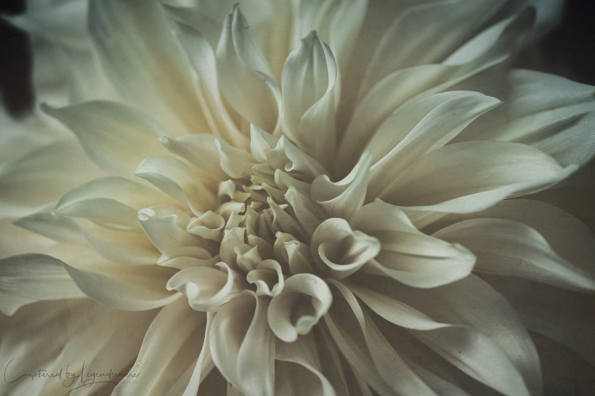 Laissez-vous envoûter par la beauté hypnotique de cette dahlia blanc aux pétales d’une délicatesse infinie, capturée dans un instant d’éternité pure où le temps semble suspendu dans un souffle de grâce naturelle.