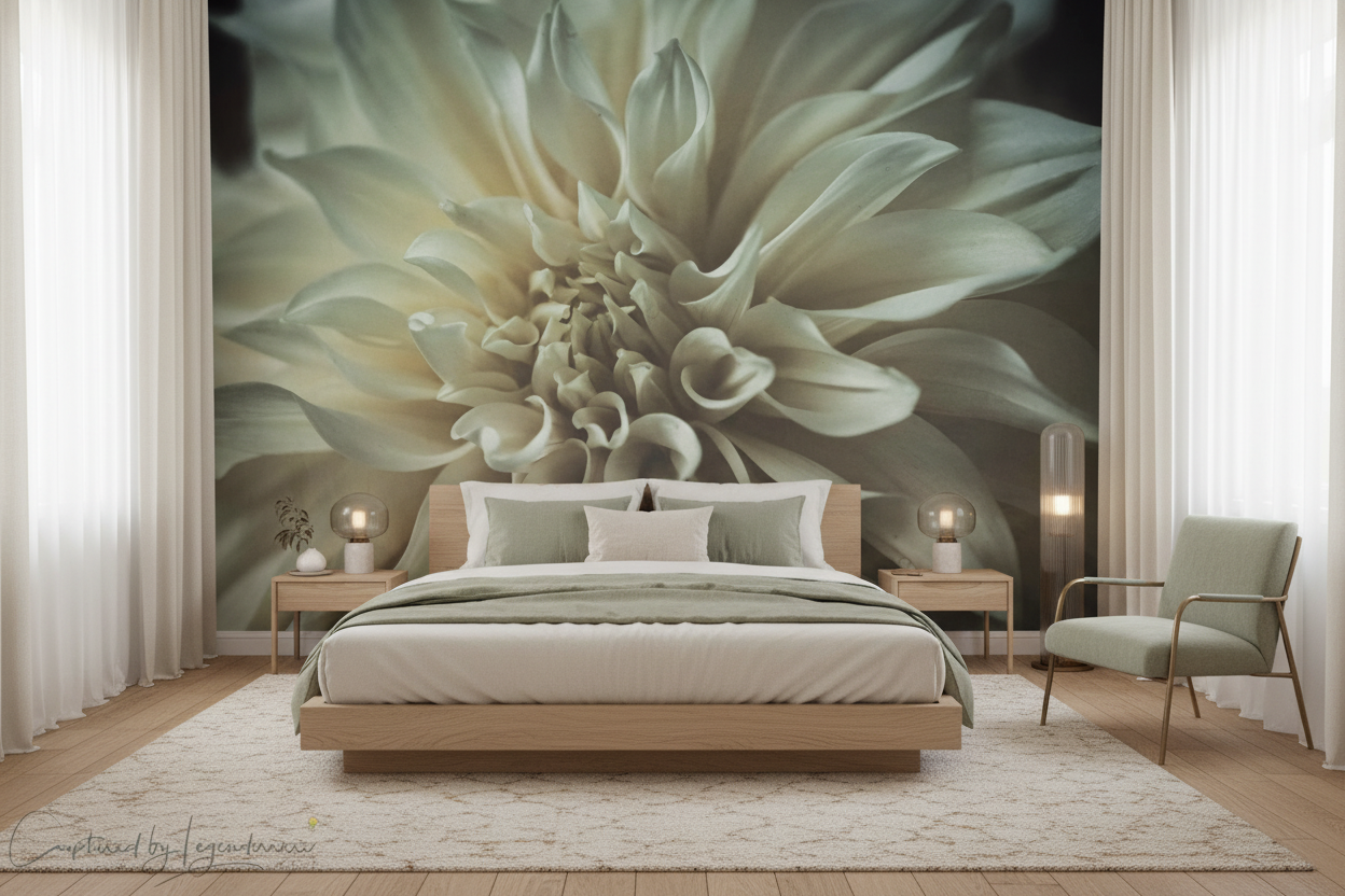 Ce papier peint floral minimaliste révèle la magnificence d’une fleur dahlia photographiée dans ses moindres détails, dévoilant la complexité géométrique de ses pétales nacrés qui se déploient en spirales parfaites. L’approche macro artistique de cette composition transforme chaque courbe, chaque ombre subtile en une œuvre d’art murale d’exception. Les tons blanc cassé et beiges poudrés se mêlent harmonieusement aux nuances ivoire et crème, créant une palette chromatique d’une sophistication remarquable. Cette photographie haute définition capture la texture veloutée des pétales avec une précision saisissante, révélant les jeux d’ombres et de lumières qui sculptent naturellement cette merveille botanique.