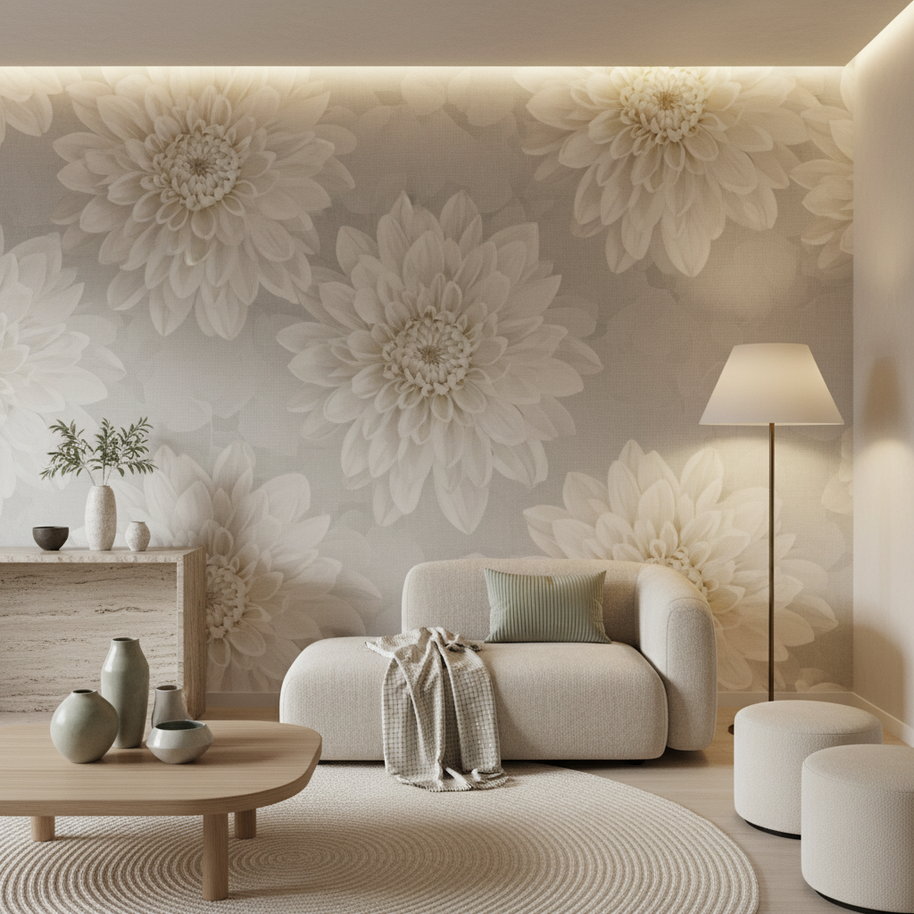 Ce papier peint chambre zen trouve sa place idéale dans une chambre parentale où il créera une ambiance propice à la détente et au repos réparateur. Dans un salon moderne, positionné sur un mur d’accent, il dialogue magnifiquement avec du mobilier scandinave aux lignes épurées, des matières naturelles comme le lin brut et le bois clair. Pour sublimer cette composition, associez-la à des teintes poudrées telles que le rose poudré, le gris perle ou le beige sable. Des accessoires en laiton brossé ou en céramique artisanale viendront compléter parfaitement cette esthétique slow living. Ce papier peint fleur géante transforme également un bureau ou un espace de travail en sanctuaire inspirant, favorisant la créativité et la concentration.