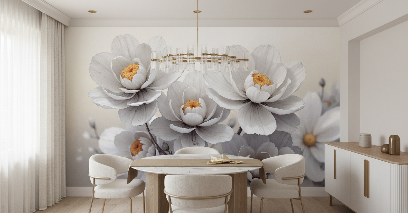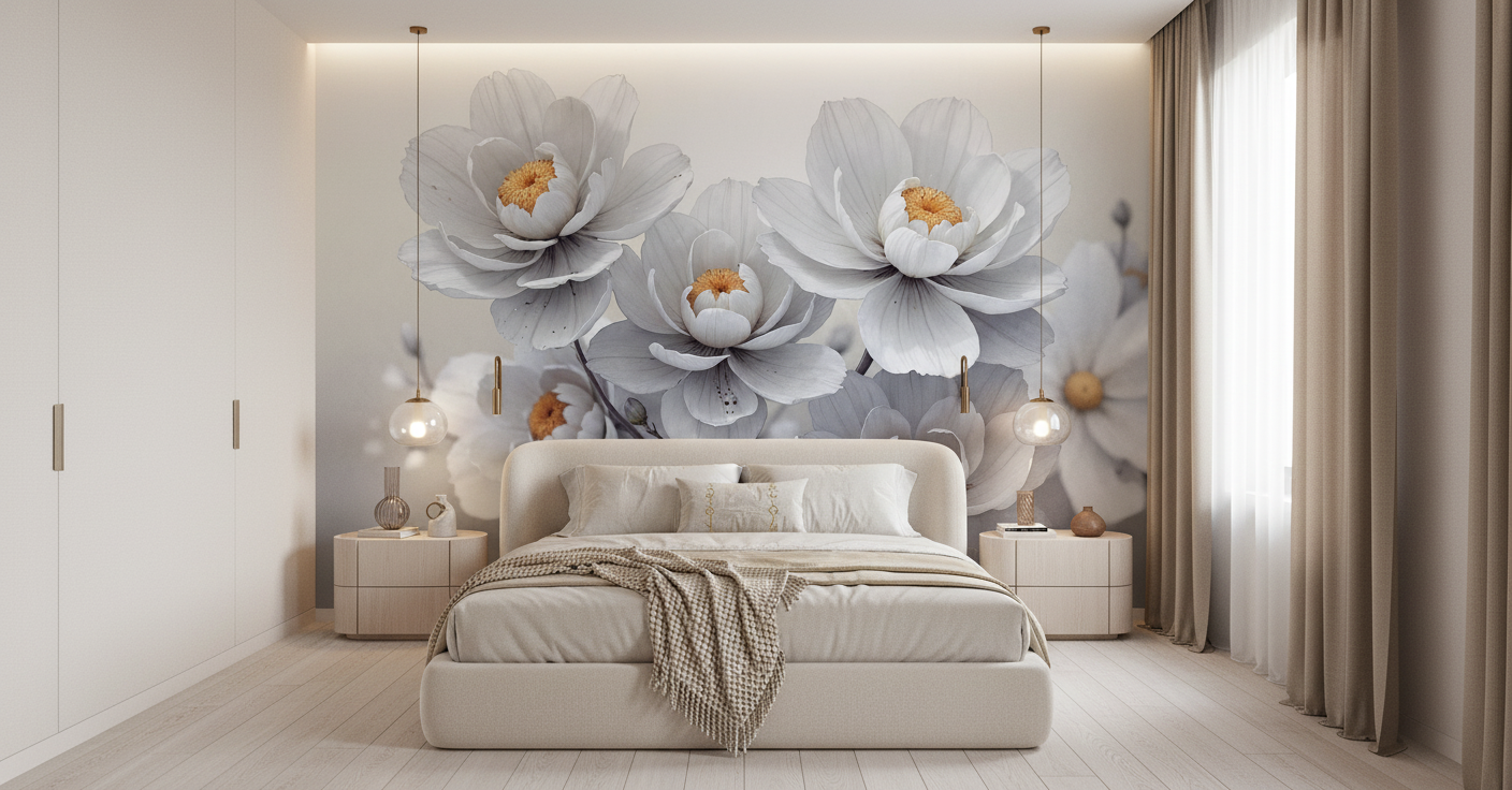 Comme une parenthèse de sérénité suspendue dans le temps, ce papier peint floral révèle la beauté épurée de fleurs délicates aux pétales nacrés, baignées dans une lumière douce et poudrée qui transforme chaque regard en moment de contemplation.