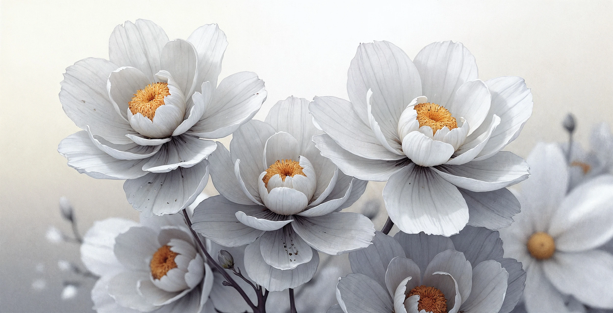 Ce papier peint fleurs blanches dévoile un bouquet de fleurs aux allures de pivoines ou d’anémones, magistralement représentées dans un style aquarelle délicat. Chaque fleur blanche s’épanouit avec grâce, révélant un cœur doré orangé aux étamines finement texturées qui apportent une touche de chaleur subtile à l’ensemble. Les pétales soyeux se déploient en corolles généreuses, créant un jeu d’ombres et de lumières d’une sophistication rare. La palette monochrome oscille entre des nuances de blanc pur, de gris perle et de beige poudrée, ponctuée par ces précieux accents dorés qui illuminent la composition.