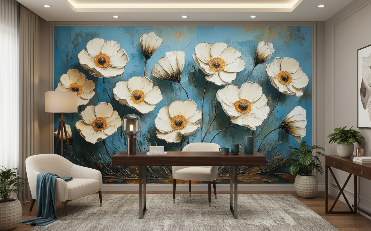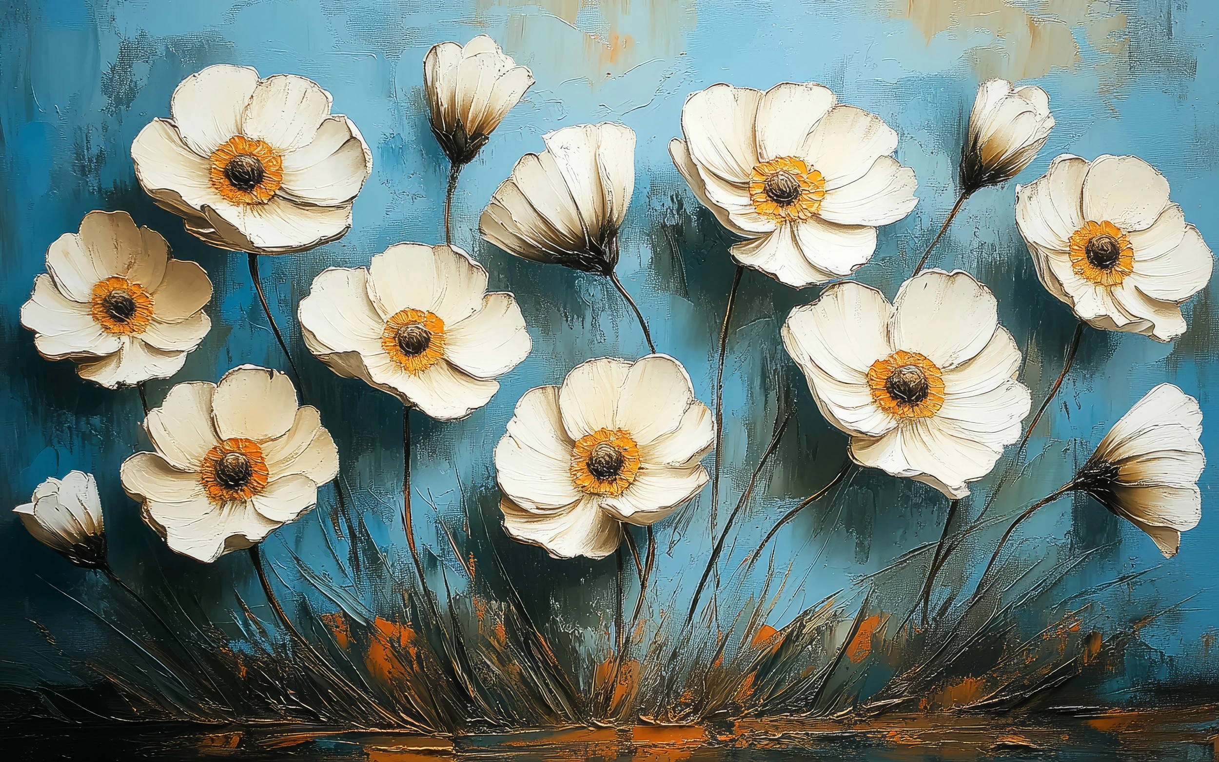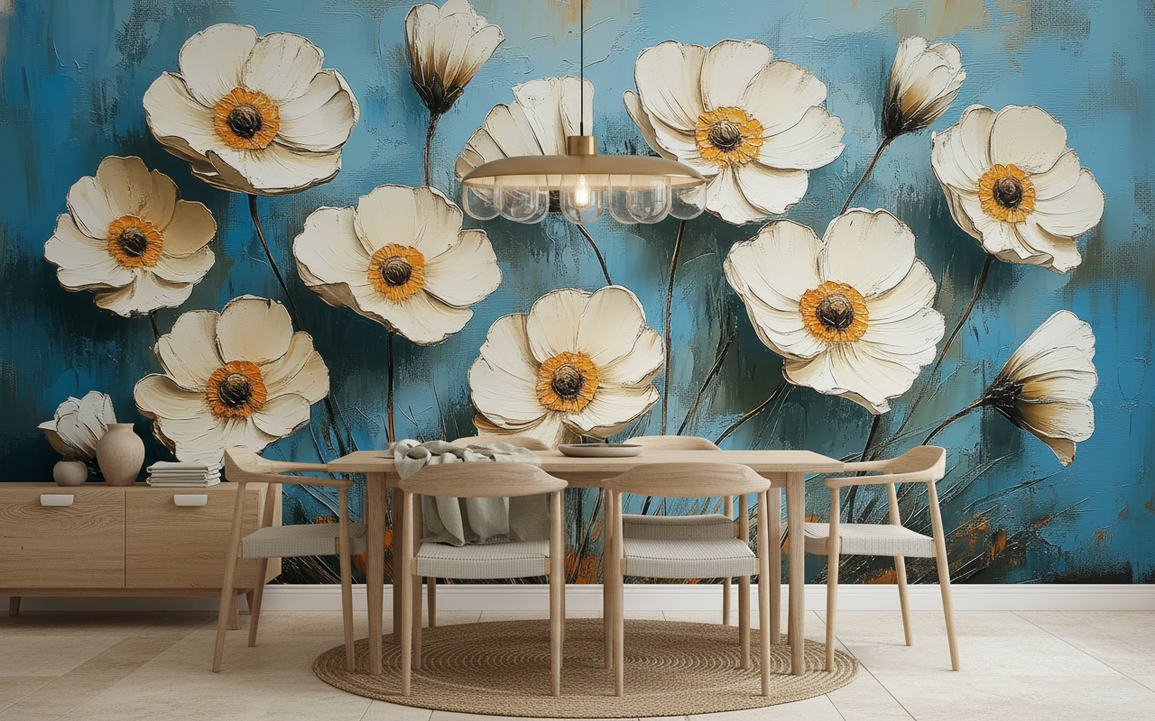 Ce papier peint floral révèle une collection raffinée d’anémones aux pétales blanc nacré, sublimées par des cœurs dorés et des pistils sombres qui apportent une profondeur saisissante à la composition. Chaque fleur, peinte dans un style artistique à mi-chemin entre l’aquarelle impressionniste et la peinture à l’huile, dévoile des détails minutieux : des nervures délicates, des ombres subtiles et des reflets lumineux qui donnent vie à cette prairie céleste. Le fond bleu dégradé, ponctué de nuances turquoise et de touches beiges dorées, évoque un ciel changeant où se mêlent aurore et crépuscule.