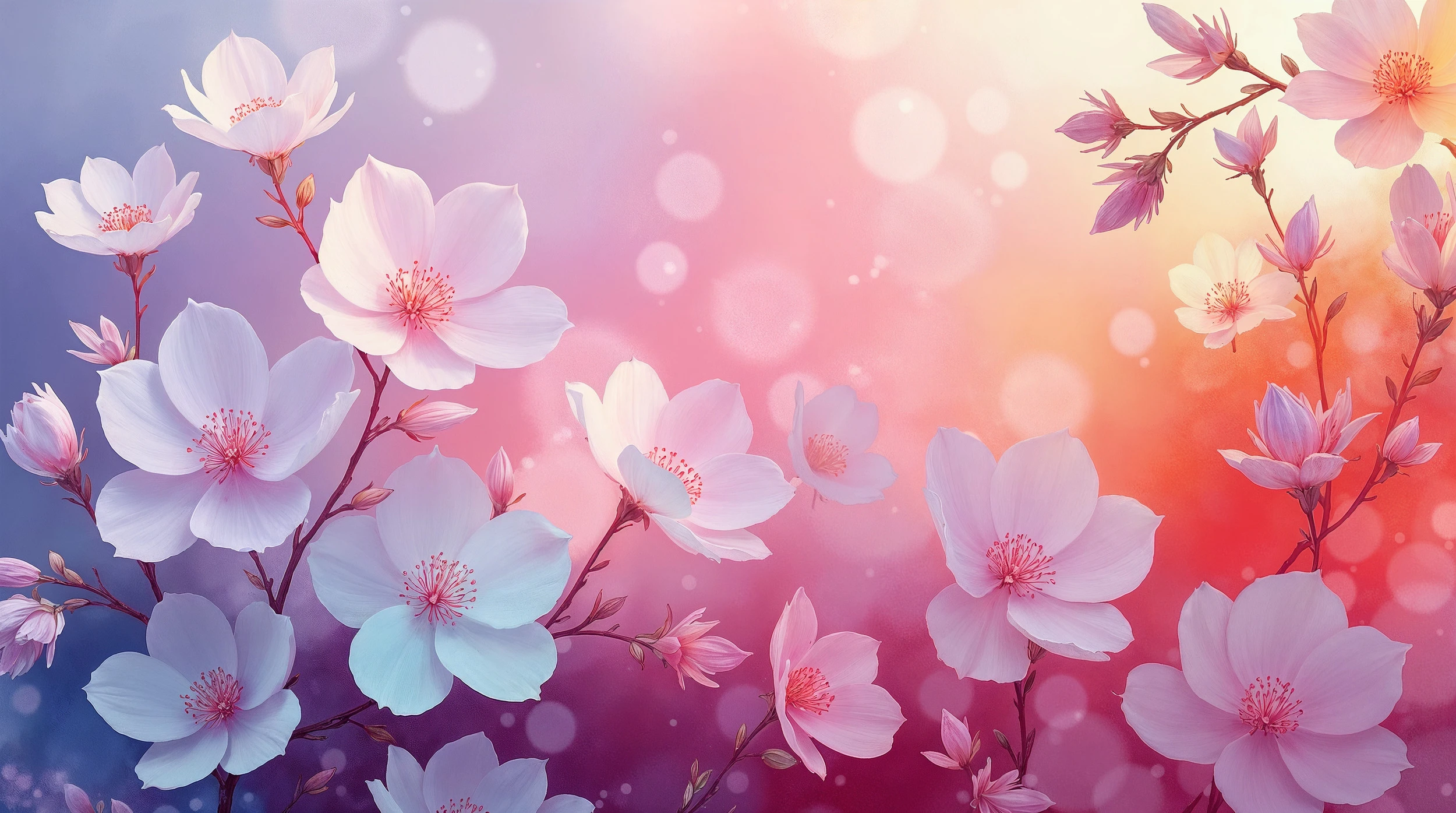 La palette chromatique se compose de tons pastel sublimes : des roses poudrés se mêlent aux violets tendres, tandis que des nuances corail et pêche réchauffent l’ensemble. Le fond présent un dégradé onirique qui évolue du bleu lavande vers des teintes orangées, ponctué de bokeh lumineux qui évoquent une rosée matinale captant les premiers rayons du soleil.