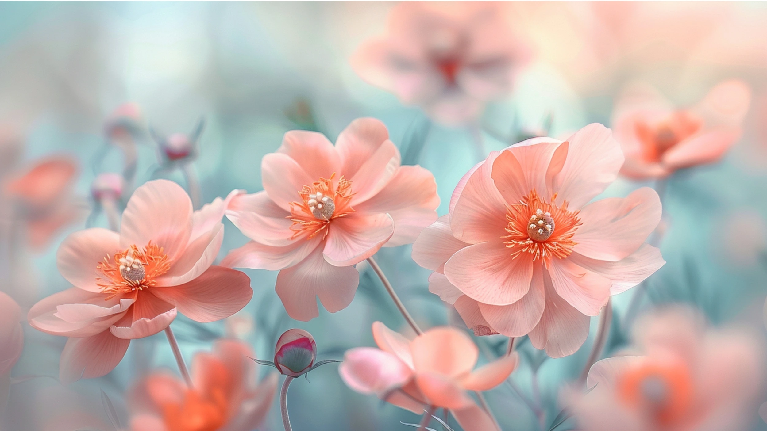 Ce magnifique papier peint à motifs floraux met en scène des pavots aux nuances coral et pêche, délicatement posés sur un fond turquoise pastel d’une douceur remarquable. L’style photographique artistique confère une dimension quasi-réaliste à ces fleurs épanouies, dont les étamines dorées scintillent comme autant de bijoux précieux. Les pétales translucides révèlent une texture soyeuse, tandis que les boutons fermés promettent une éclosion future, ajoutant une dimension narrative captivante.