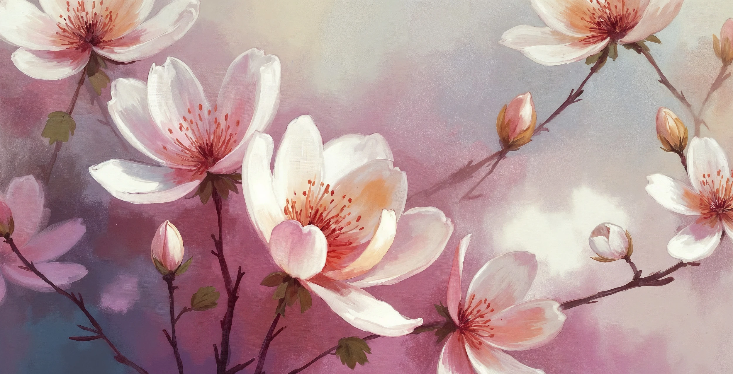 L’arrière-plan se pare d’un dégradé poétique oscillant entre mauve tendre et gris perle, évoquant les premières lueurs de l’aube ou la douceur d’un crépuscule printanier. Cette palette chromatique sophistiquée marie harmonieusement les tons pastel et les nuances poudrées, créant une atmosphère à la fois apaisante et romantique.